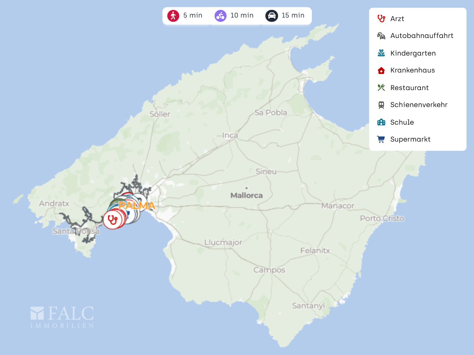 Insgesamt bietet die Lage eine ausgewogene Mischung aus ruhigem Wohnen, guter Infrastruktur und schneller Erreichbarkeit von Palma, Küste und Flughafen.