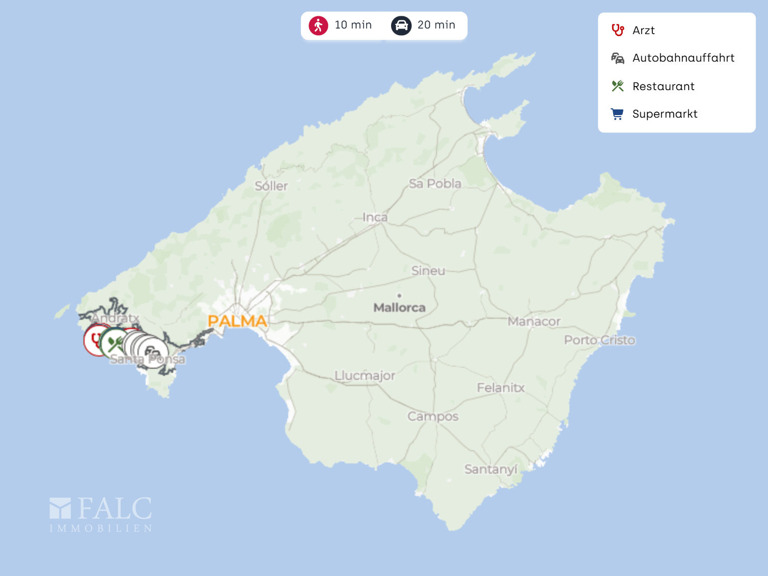 Die nächste Bushaltestelle Palmira 1 (Peguera) liegt in der Nähe und bietet eine unkomplizierte Anbindung in die Umgebung. Mit dem Auto erreichen Sie die nächste Autobahnauffahrt in wenigen Minuten, was Fahrten entlang der Südwestküste besonders komfortabel macht. Der Flughafen Palma de Mallorca ist je nach Verkehr in etwa 30 Minuten erreichbar und damit auch für regelmäßige An und Abreisen sehr gut angebunden.