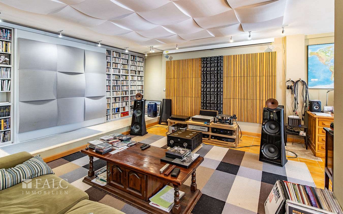 Die Wohnräume verteilen sich auf einer bebauten Fläche von ca. 283 m² über drei Etagen. Der sehr gemütliche und helle Wohnbereich mit Kamin bietet Zugang zu einer großen Terrasse. Von hier führen einige Stufen hinunter in den Garten mit Pool. Angrenzend an den Wohnbereich befinden sich die ausgestattete Küche und der Essbereich.