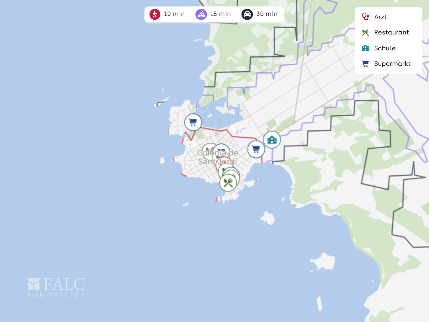Ein Arzt ist in ca. 300 m erreichbar, die Postfiliale Correos liegt in ca. 600 m. Praktisch für E Mobilität ist zudem eine E Ladestation in ca. 700 m. Eine Tankstelle wie die Estació de Servei Repsol Colonia de Sant Jordi befindet sich in ca. 900 m.