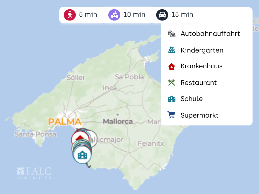 Die nächste Bushaltestelle erreichen Sie in wenigen Gehminuten, was eine unkomplizierte Anbindung in die Umgebung ermöglicht. Mit dem Auto sind die nächsten Autobahnauffahrten in kurzer Zeit erreichbar. Der Flughafen Palma de Mallorca liegt je nach Verkehrslage etwa 15 Kilometer entfernt und ist damit gut erreichbar, ideal für Pendler, Zweitwohnsitz oder regelmäßige Reisen.