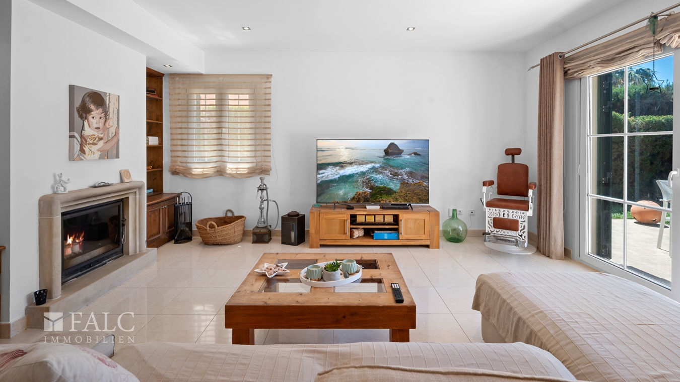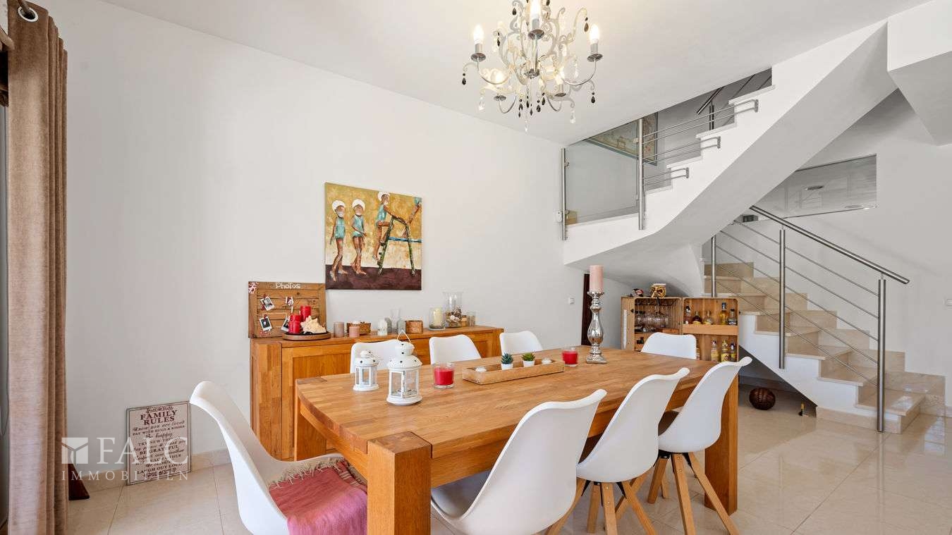 Im Erdgeschoss befinden sich eine separate, voll ausgestattete Küche, ein lichtdurchfluteter Wohn-/Essbereich mit Kamin und direktem Zugang zur schönen Außenterrasse, ein Badezimmer sowie eine Waschküche. Im ersten Stock stehen drei großzügige Schlafzimmer mit Einbauschränken und zwei Badezimmer – eines davon en suite – zur Verfügung. Das Hauptschlafzimmer bietet zudem eine Ankleide sowie eine private Terrasse mit herrlichem Blick auf die umliegende Landschaft.