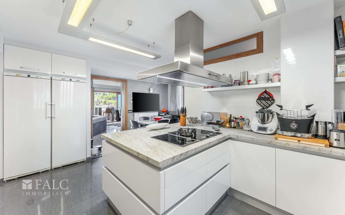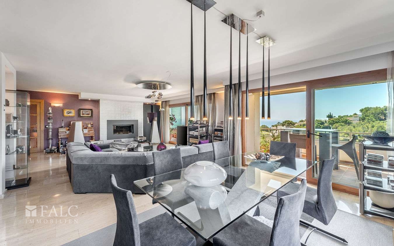 Die nach Süden ausgerichtete Wohnung verfügt über eine grosszügige bebaute Fläche von ca. 317 m² (davon etwa 240 m² Wohnfläche), die sich wie folgt aufteilen: Ein einladender Eingangsbereich führt in das sehr geräumige Wohn-/Esszimmer mit Kamin und Zugang zu einer ca. 50 m² grossen Terrasse mit Panoramablick auf die mediterrane Umgebung und das traumhafte Meer. Zudem gibt es eine grosse, komplett möblierte Küche, vier geräumige Schlafzimmer, drei Badezimmer, einen Hauswirtschaftsraum sowie ein Gäste-WC.
