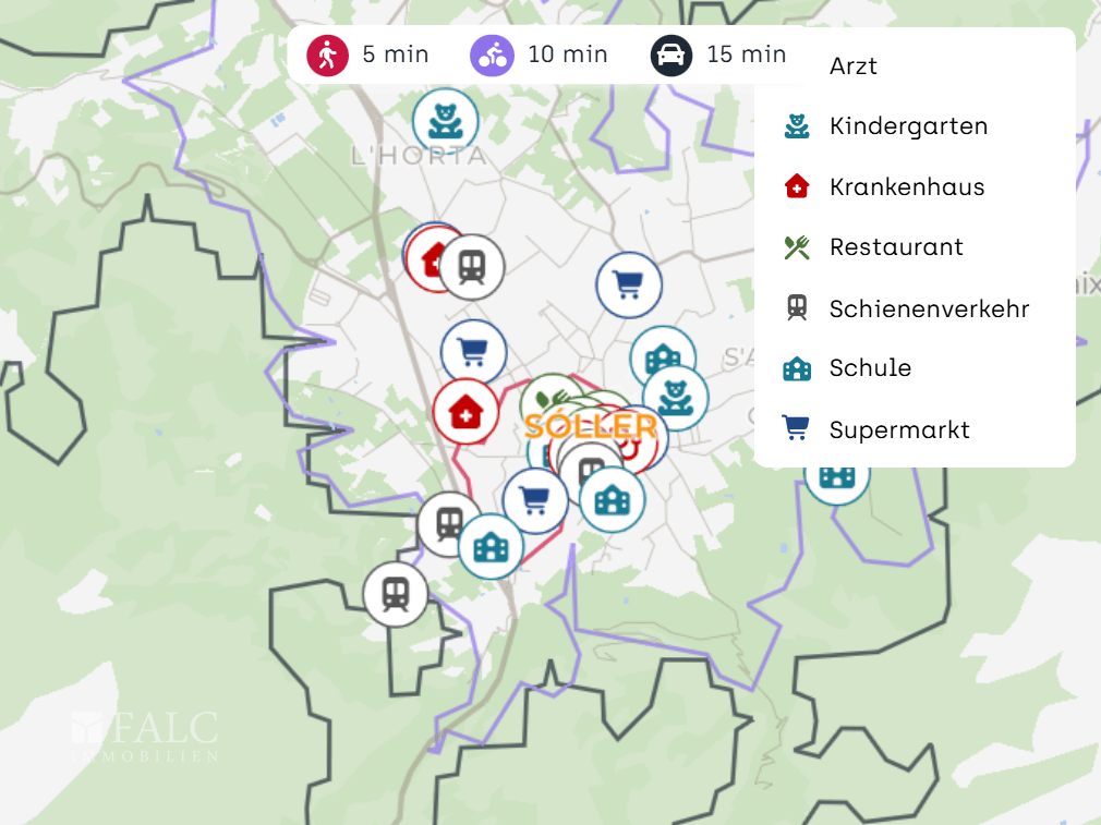 Die Anbindung ist ein klarer Pluspunkt: Der Bahnhof Sóller sowie die Tram Station Plaça d’Espanya sind fußläufig erreichbar und bieten eine charmante Verbindung innerhalb des Ortes sowie Richtung Port de Sóller. Mehrere Bushaltestellen liegen ebenfalls in der Nähe.