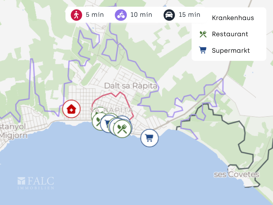 Für kleine Besorgungen und den täglichen Bedarf bietet sich der Ortskern von Campos an, der in wenigen Minuten mit dem Auto erreichbar ist. Dort finden Sie Supermärkte, Bäckereien, Banken und weitere Dienstleistungen. Auch Apotheken und ärztliche Anlaufstellen sind typischerweise im Umfeld des Ortszentrums gebündelt.