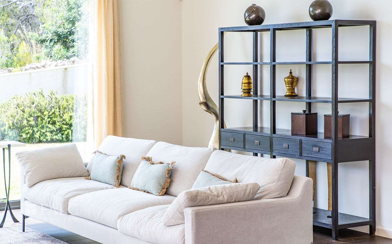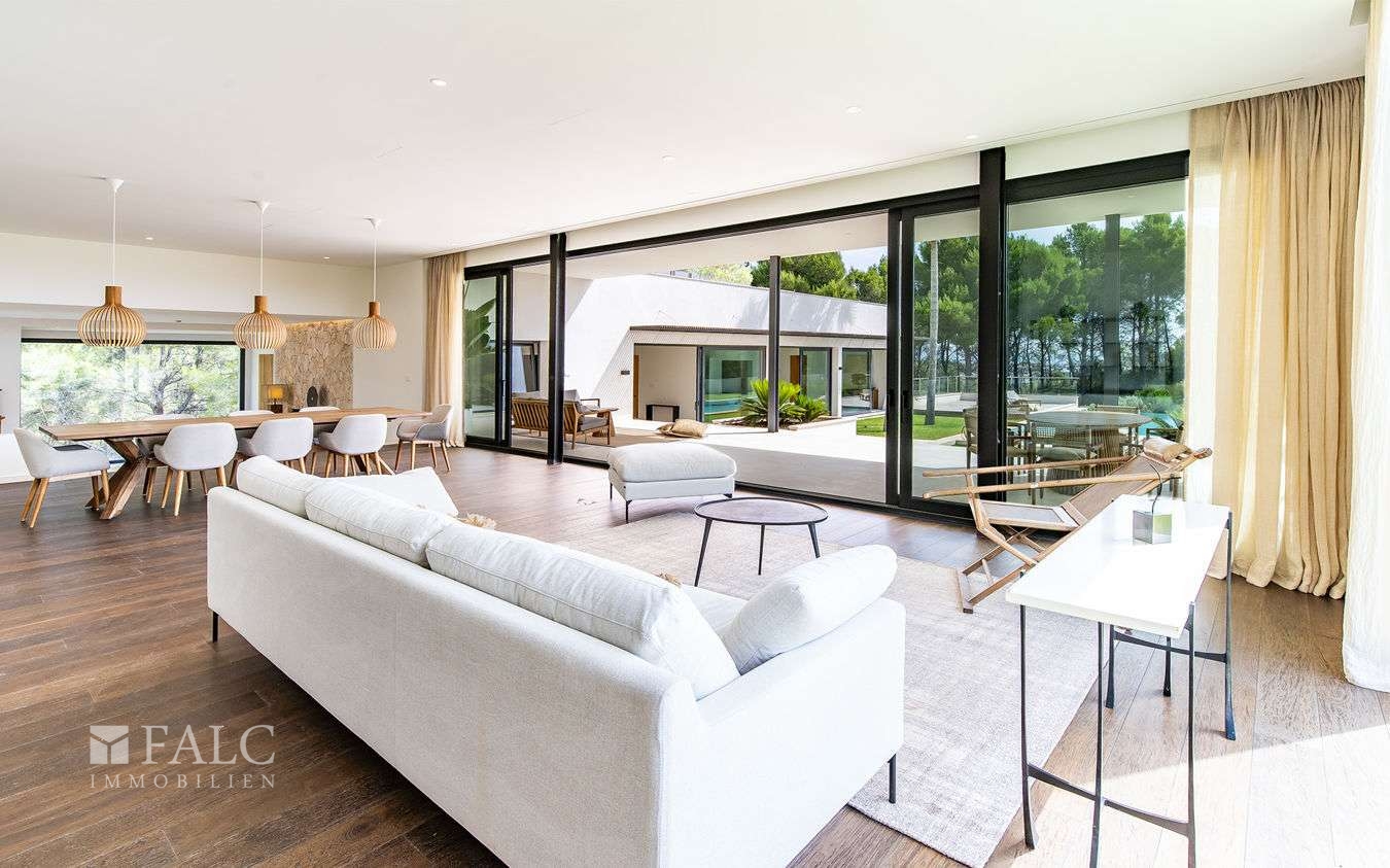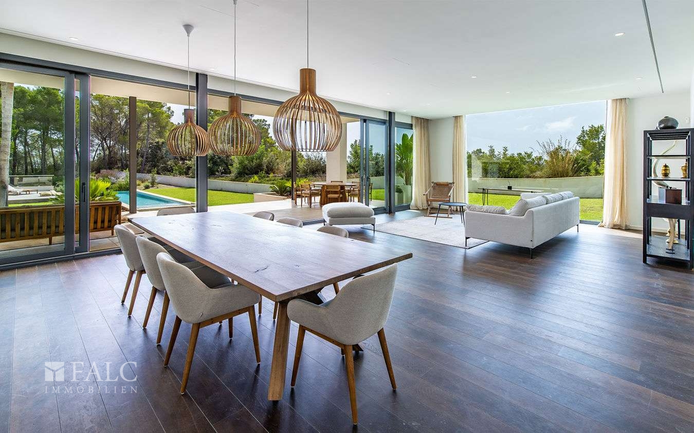Der lichtdurchflutete Wohn-/Essbereich mit einer offenen Küche führt zur grossen Aussenterrasse und erweitert den Wohnraum. Von hier hat man Zugang in den weitläufigen Garten und zum Salzwasserpool. Die grossen Fensterflächen lassen sich weit öffnen und schaffen eine harmonische Verbindung zum mediterranen Aussenbereich.
