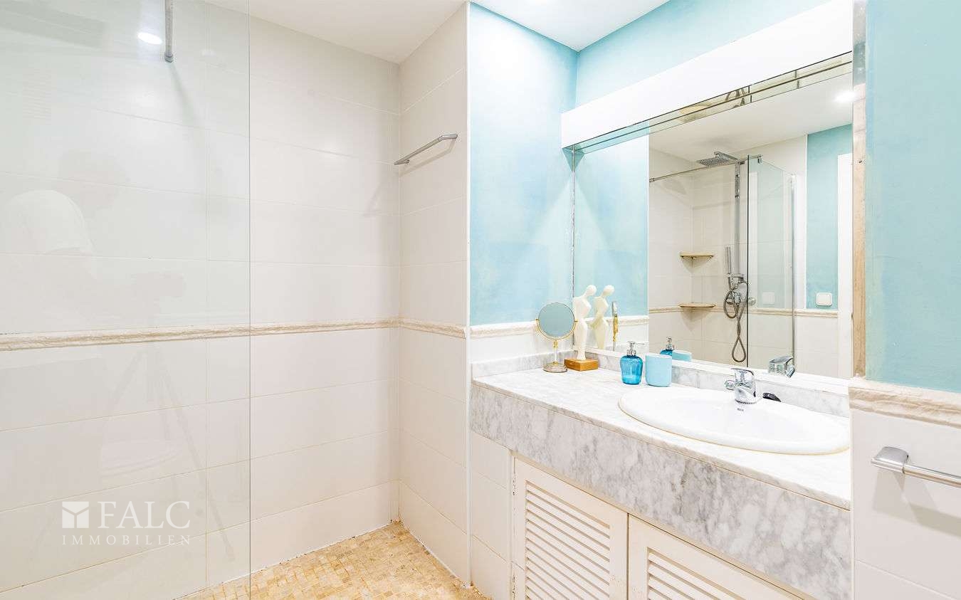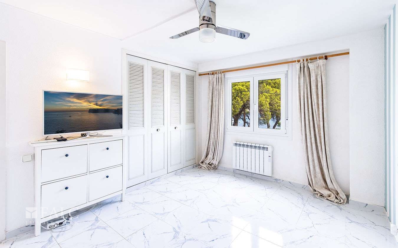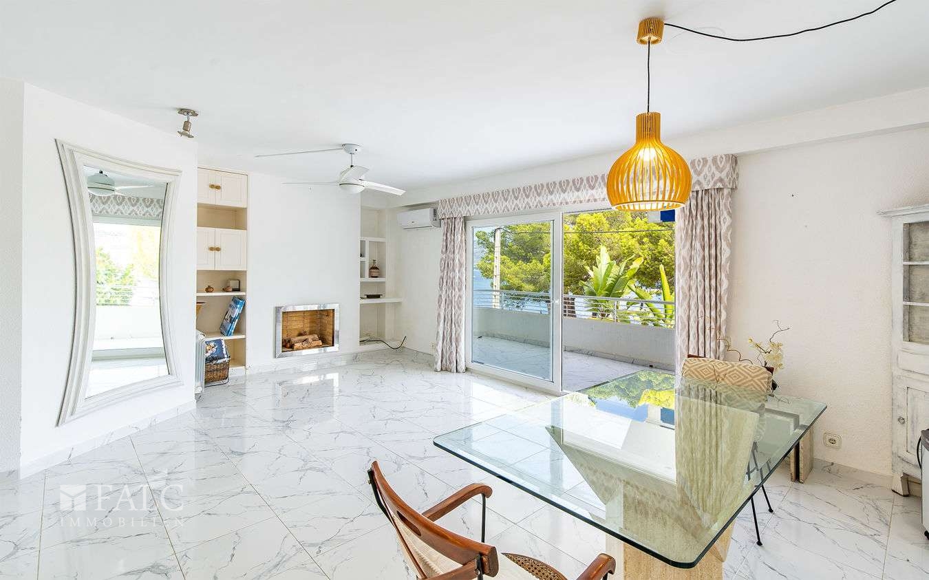 Im begehrten Südwesten Mallorcas und mit fabelhaftem Meerblick dank der hervorragenden Lage in erster Meereslinie, präsentieren wir Ihnen dieses schöne Apartment in Santa Ponsa. Die lichtdurchflutete Immobilie ist Teil einer attraktiven Gemeinschaftswohnanlage mit einem gepflegten mediterranen Garten und einer weitläufigen Terrasse mit Salzwasserpool zur Abkühlung. Die nach Süden ausgerichtete Wohnung hat eine bebaute Fläche von ca. 159 m2 (ca. 128 m2 Wohnfläche), die sich auf ein gemütliches Wohn-/Esszimmer mit Kamin, von dem aus Sie direkten Zugang zu der wunderschönen ca. 16 m2 großen Terrasse haben, auf der Sie den Panoramablick auf das Meer geniessen können, eine separate und voll ausgestattete Küche, 3 Schlafzimmer und 2 Bäder, eines davon en suite, verteilt. Zu diesem Immobilienangebot gehören ein Tiefgaragenstellplatz und ein gut belüfteter Abstellraum. Weitere Ausstattungsmerkmale: Klimaanlage, Kamin, doppelt verglaste Fenster, schallisolierte Wohnzimmerfenster, Marmorboden, elektrische Heizkörper, Einbauschränke, Waschküche, Rollläden und vieles mehr.