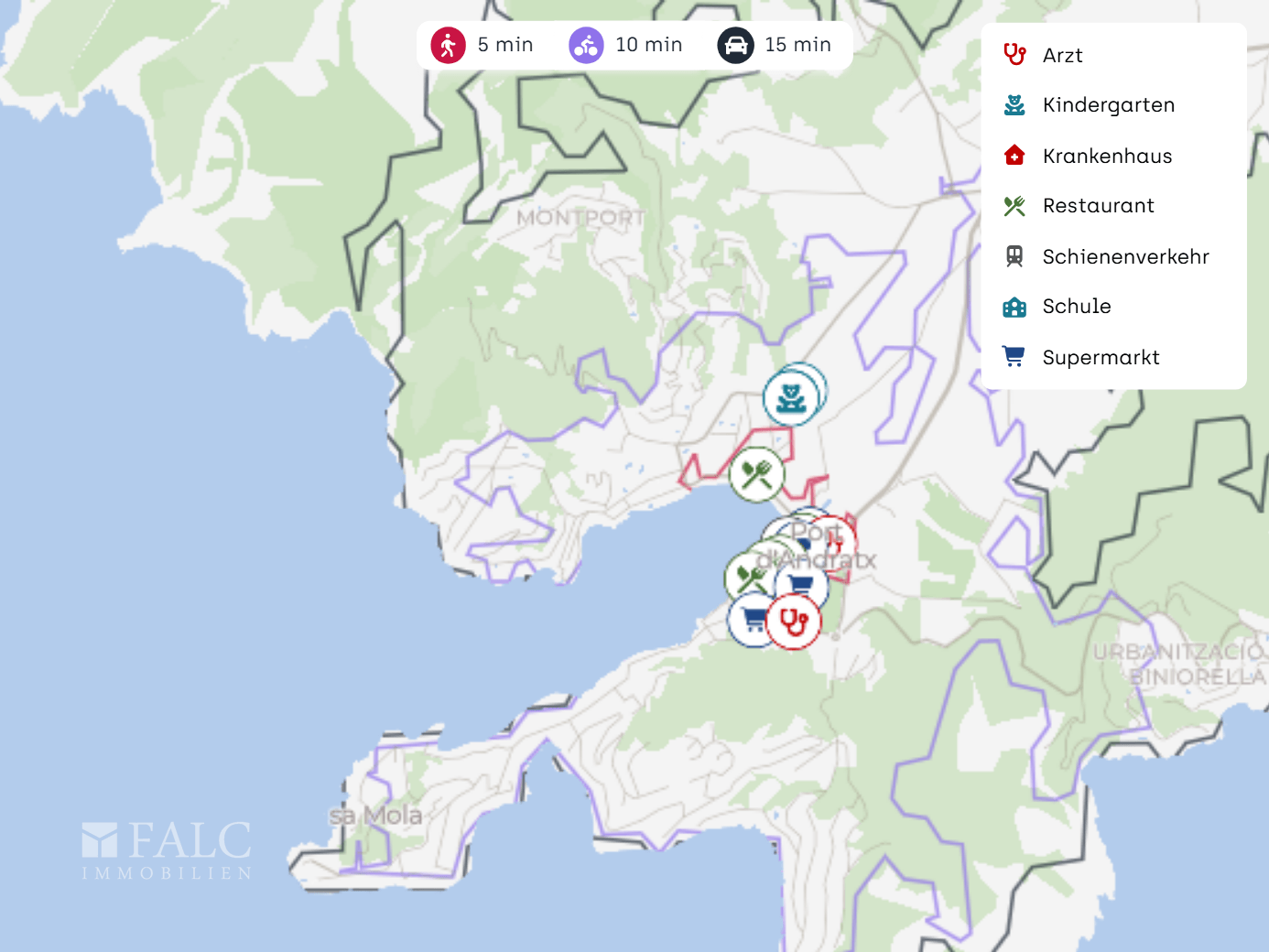 Die nächste Bushaltestelle Llotja Port d Andratx ist fußläufig erreichbar und bietet eine praktische Anbindung. Mit dem Auto ist die Autobahnauffahrt in etwa wenigen Minuten erreichbar. Der Flughafen Palma de Mallorca liegt je nach Verkehrslage in etwa 40 km Entfernung und ist damit gut erreichbar.