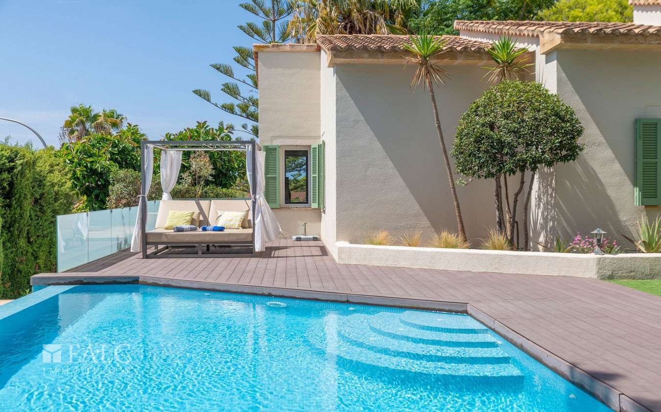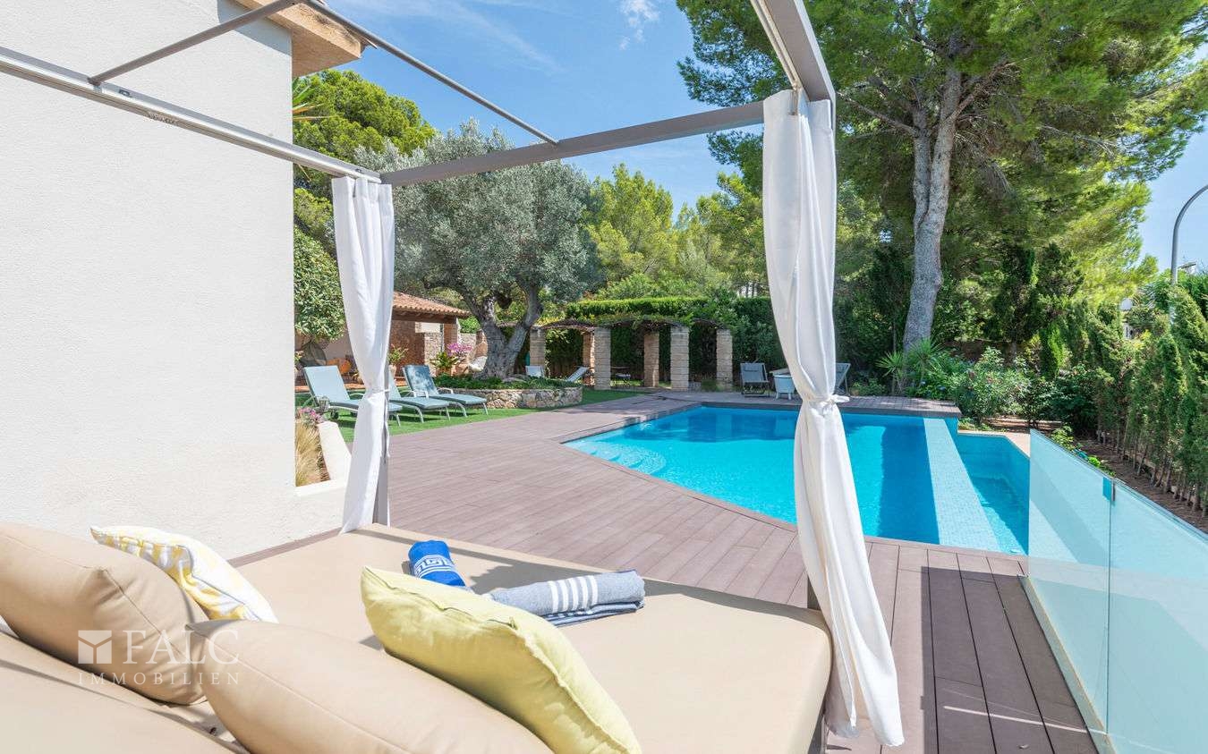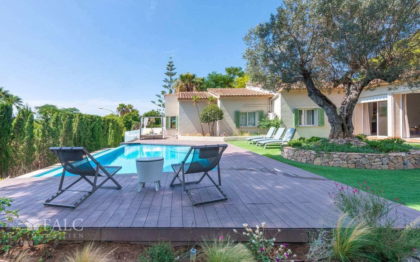 Diese attraktive, einstöckige Familienvilla in Santa Ponsa befindet sich in einer ruhigen Wohngegend im begehrten Südwesten Mallorcas. Die traumhafte Immobilie mit einer Wohnfläche von ca. 410 m² besticht durch eine raffinierte Mischung aus Komfort, Eleganz und mediterranem Stil und liegt auf einem gepflegten, sonnigen Grundstück von ca. 1.400 m².
