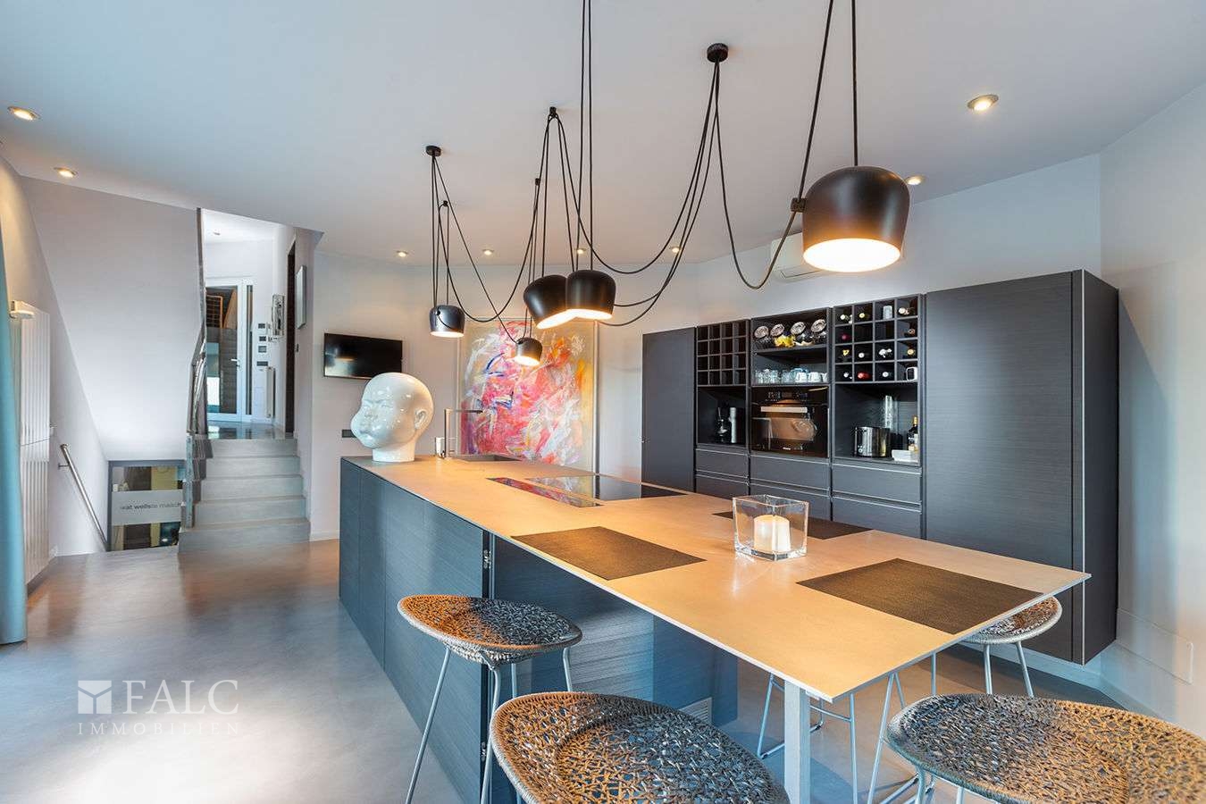 Im trendig-modernen Stil gestaltet, besticht diese halbmondförmige Villa mit einer bebauten Fläche von ca. 344 m², die sich auf drei elegante Ebenen verteilt. Die Eingangsebene bietet ein Wohnzimmer mit Kamin sowie eine offene Küche mit Essbereich – jeweils mit vorgelagerter verglaster Veranda –, zwei Schlafzimmer mit Bad en Suite und ein Gäste-WC. Von dieser Ebene hat man Zugang zur grossen, offenen Terrasse mit Salzwasser-Infinitypool sowie zum Gartenbereich.