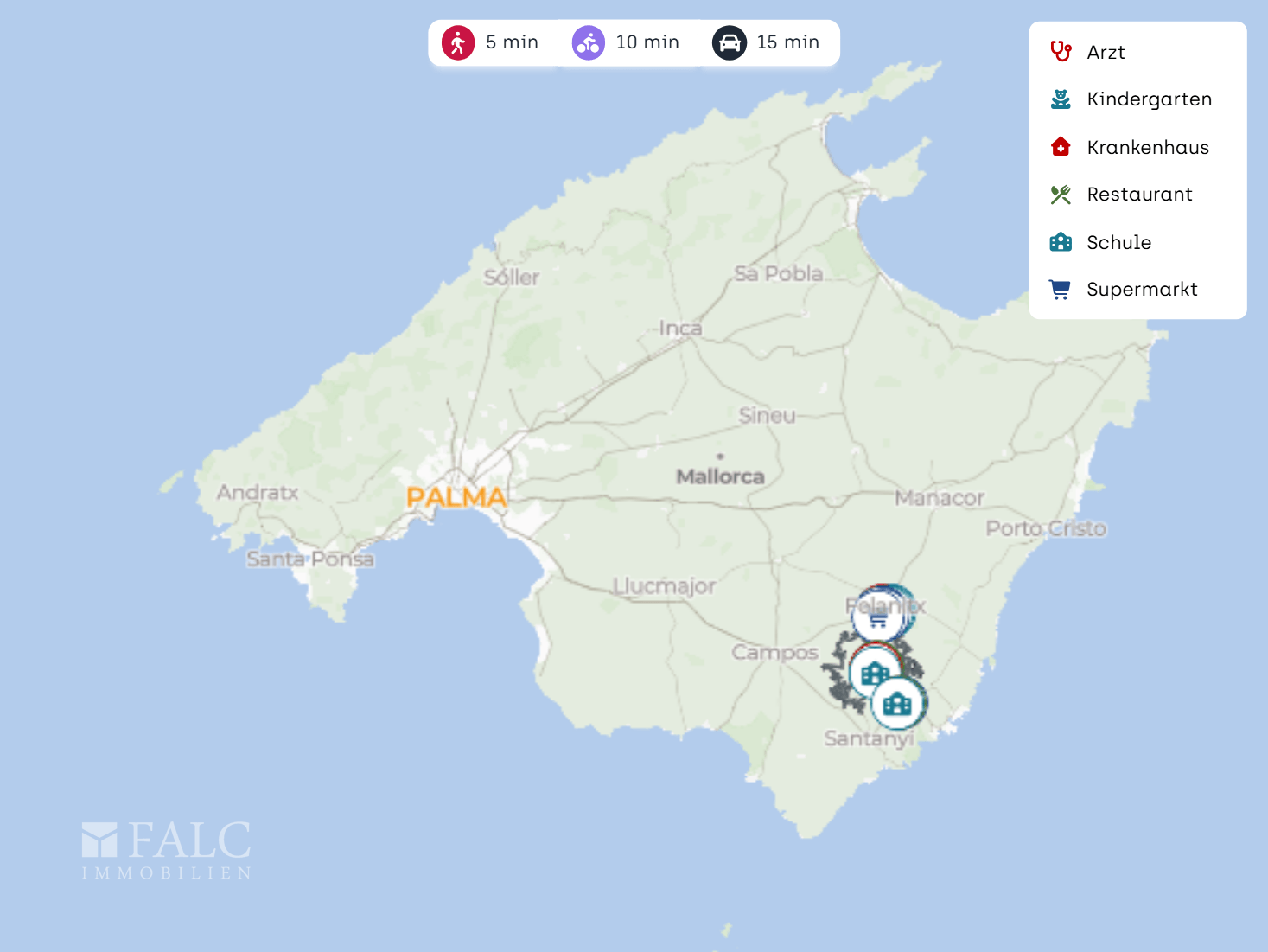Die Immobilie in Cas Concos bietet eine hervorragende Lage für all jene, die Ruhe und gleichzeitig eine gute Anbindung an wichtige Einrichtungen suchen. In unmittelbarer Nähe befinden sich mehrere Bushaltestellen, die eine bequeme Verbindung zu den umliegenden Städten und Dörfern ermöglichen. Die nächste Bushaltestelle ist nur wenige Schritte entfernt, was den täglichen Pendelverkehr erleichtert.