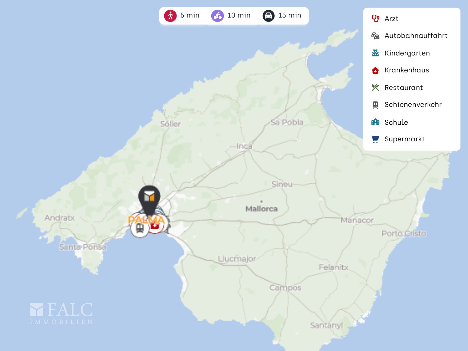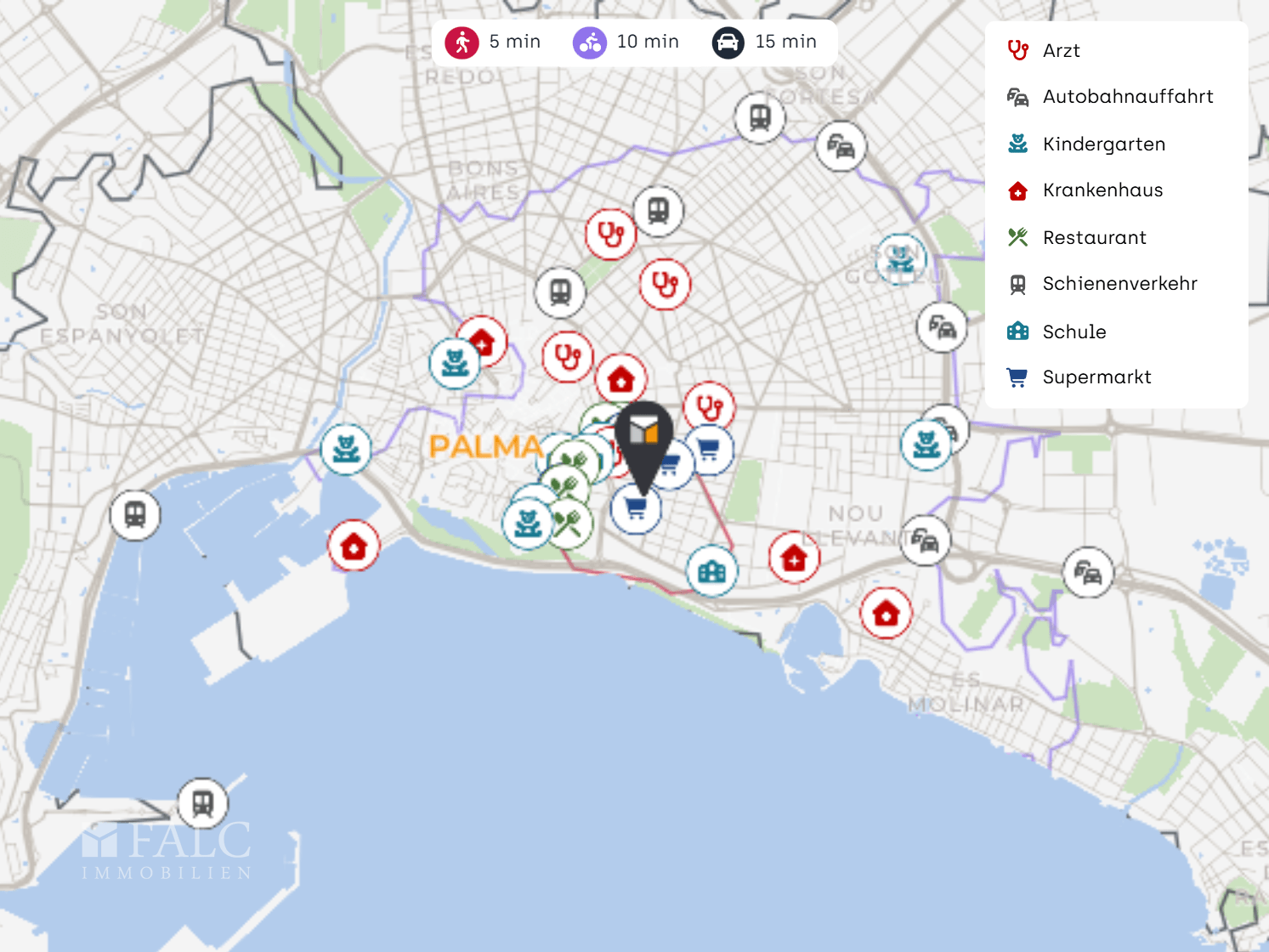 Diese Immobilie in Palma de Mallorca besticht durch ihre zentrale Lage und die hervorragende Anbindung an die städtische Infrastruktur. In unmittelbarer Nähe befinden sich zahlreiche Annehmlichkeiten, die den Alltag erleichtern und bereichern.