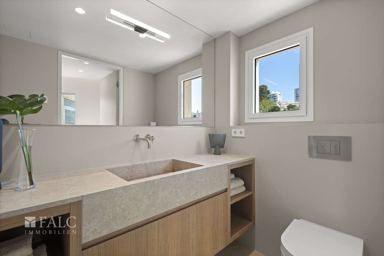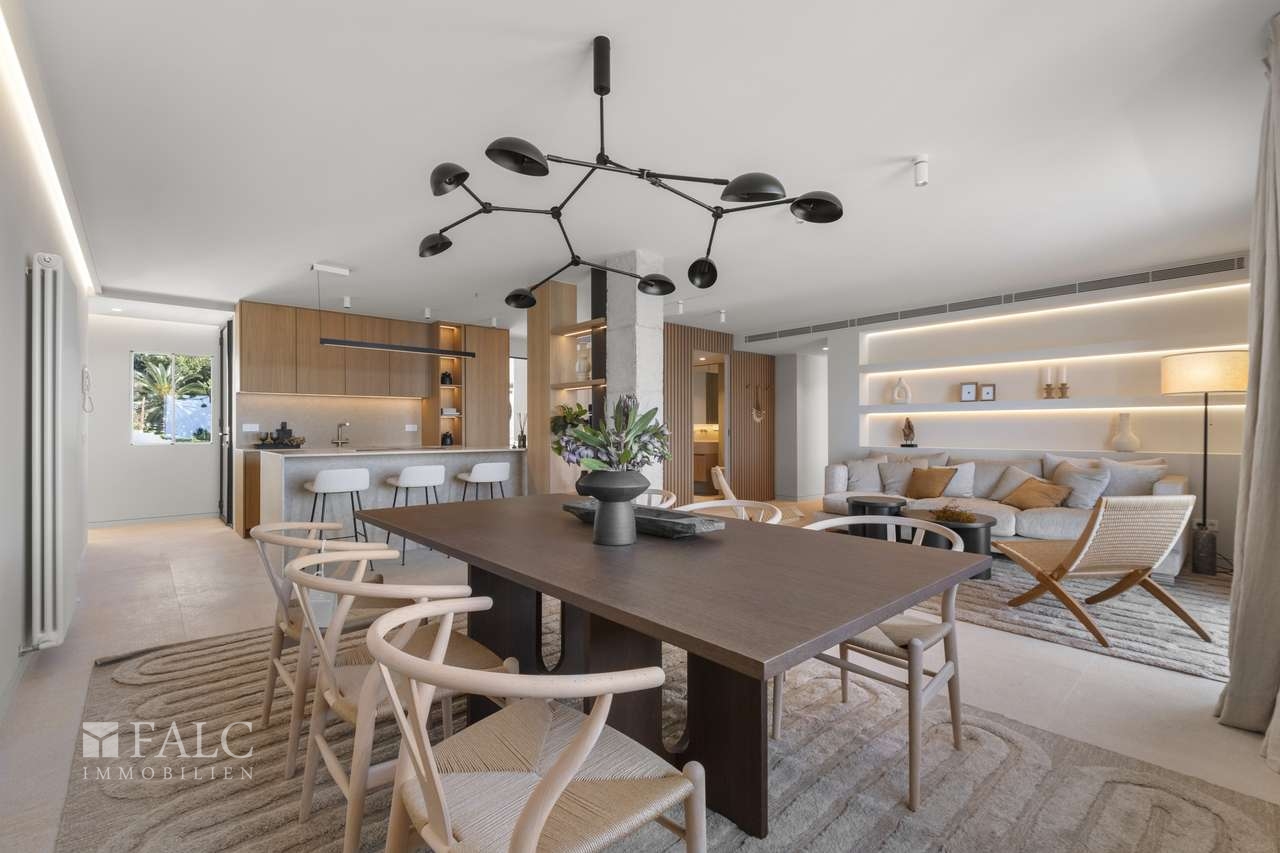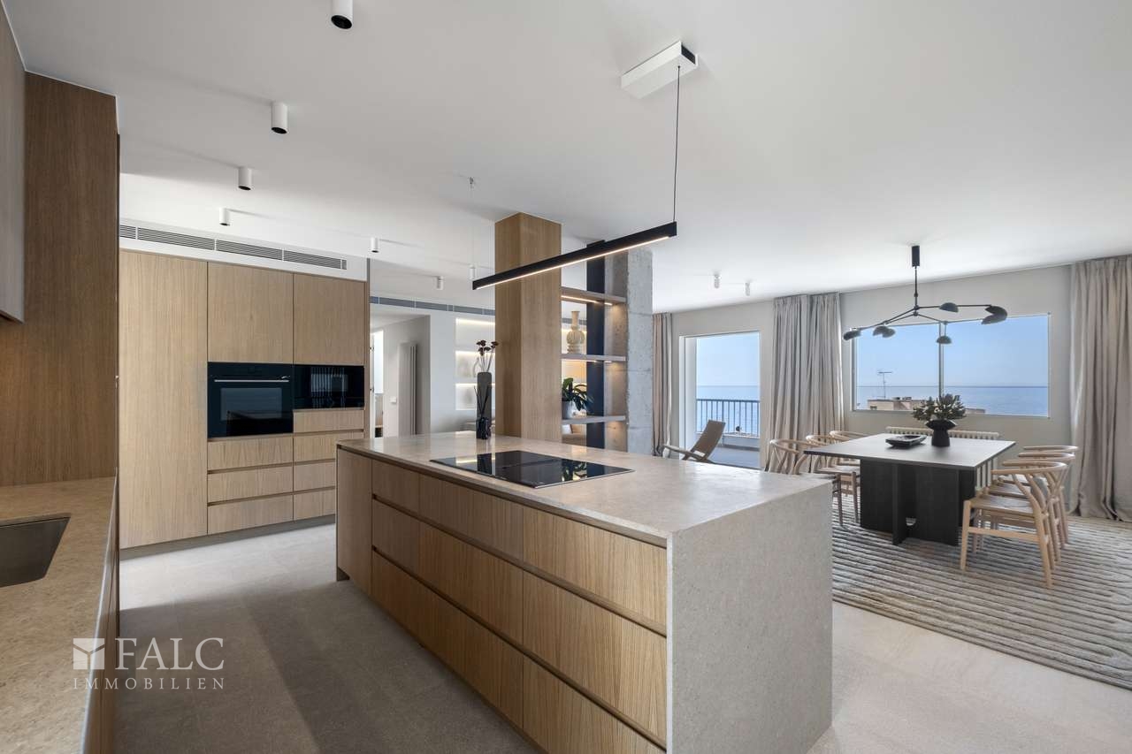 Diese atemberaubende und komplett renovierte Luxuswohnung mit traumhaften Panoramablick auf das Meer befindet sich in 2. Meereslinie in Cala Major. Die elegante und luxuriöse ca. 145 m2 grosse Wohnung wurde nach höchsten Standards sorgfältig und mit viel Liebe zum Detail renoviert, wobei nur die besten Materialien und modernste Technologie verwendet wurde, und verbindet auf perfekte Weise moderne Eleganz mit mediterranem Charme. Die herrliche ca. 15 m2 grosse und nach Südwesten ausgerichtete Sonnenterrasse bietet einen atemberaubenden und unverbaubaren Meerblick, ideal um bei einem guten Glas Wein zu entspannen. Die lichtdurchflutete Immobilie verteilt sich auf ein tolles Wohn-/ Esszimmer mit offener Küche, 3 geräumige Schlafzimmer, die für maximalen Komfort und Entspannung ausgelegt sind, 2 moderne Badezimmer mit hochwertiger Ausstattung und Verarbeitung, sowie ein zusätzliches Gäste-WC. Weitere Ausstattungsmerkmale: Hochwertige Materialien und ein zeitloses Design. Designer-Weinkühler mit Klimaanlage – perfekt für Weinliebhaber und -kenner. Vollständig mit hochwertigen Designermöbeln eingerichtet, sorgfältig ausgewählt, um einen gemütlichen, eleganten Stil mit natürlichen Akzenten widerzuspiegeln. Zentralheizung in der gesamten Wohnung und Fussbodenheizung in den Badezimmern für aussergewöhnlichen Komfort. Vollständige Isolierung in allen Räumen für eine perfekte Temperaturregulierung das ganze Jahr über und ein privater Garagenstellplatz für stressfreies Parken.