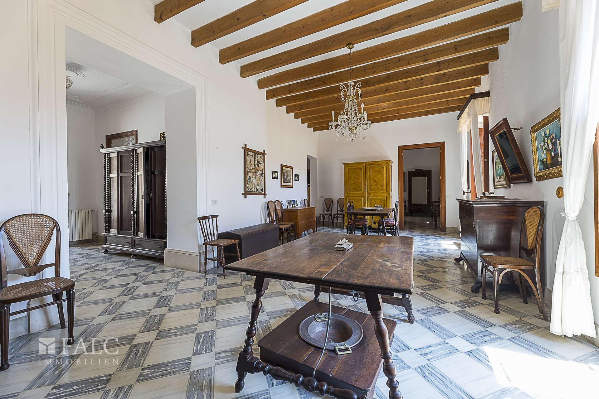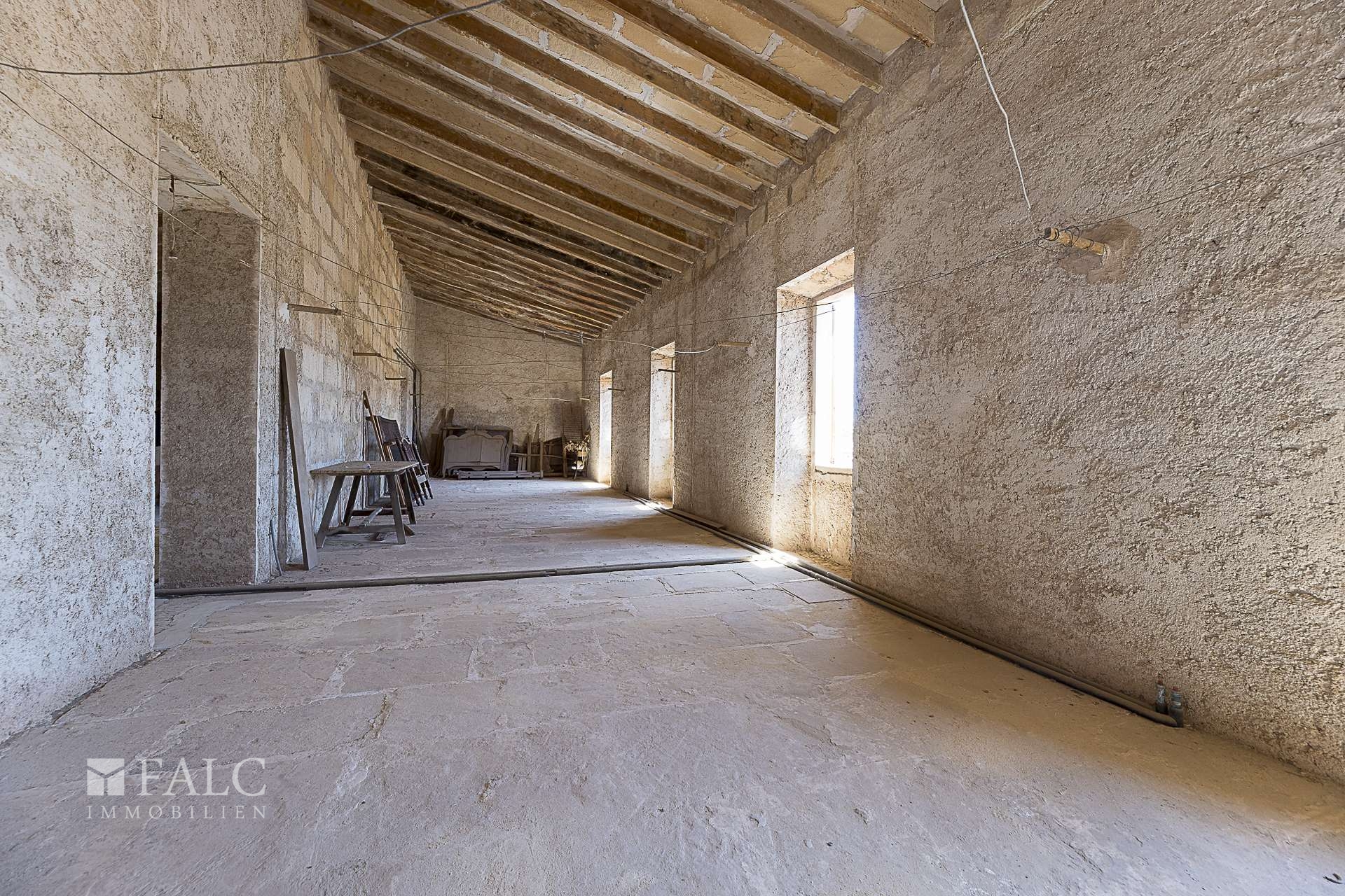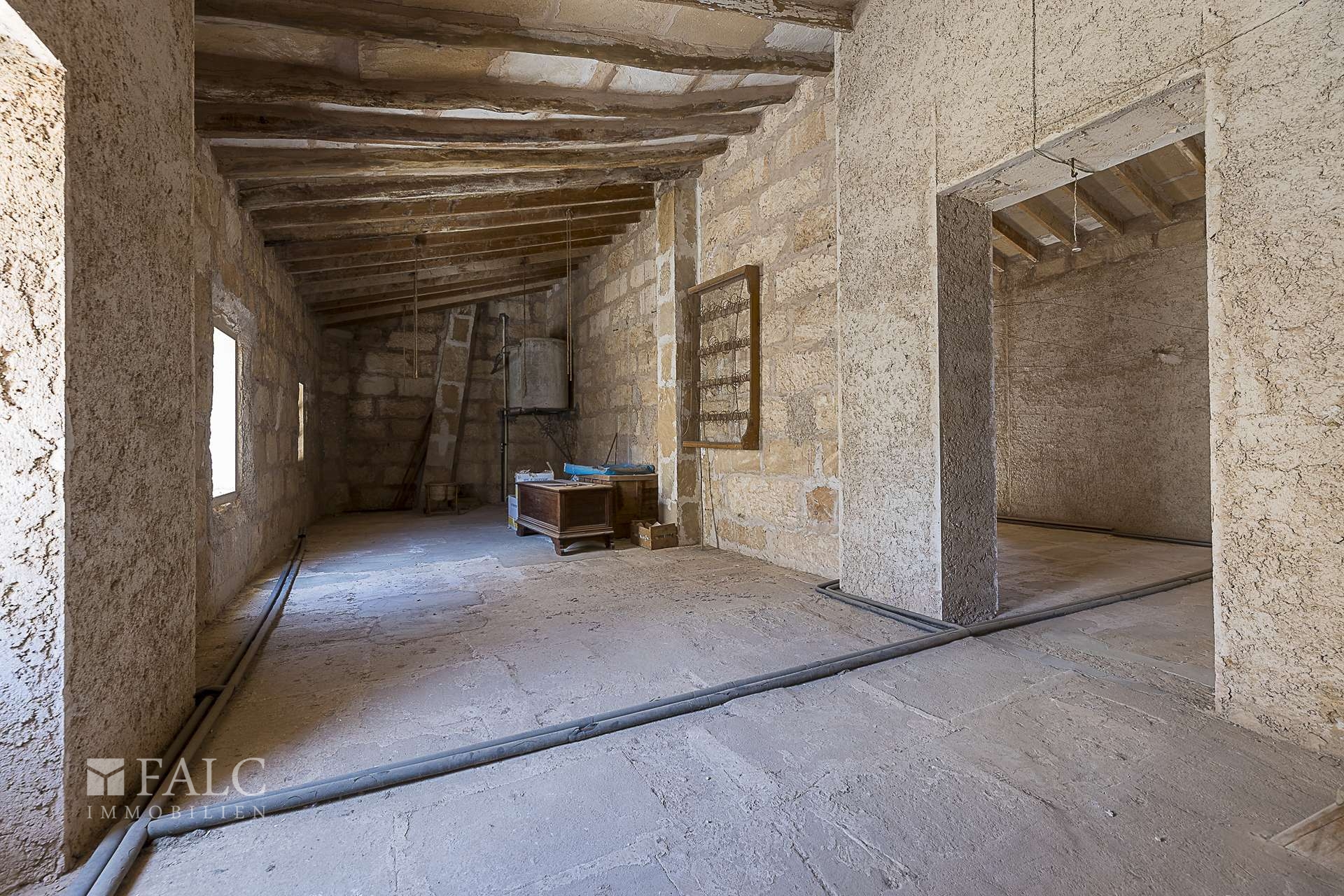 Das Haus besticht durch seine authentisch mallorquinische Bauweise, erhaltene Originalelemente wie sichtbare Holzbalken und hohe Decken verleihen dem Objekt einen besonderen Charme. Sechs Schlafzimmer, drei Badezimmer, eine separate Küche sowie ein weitläufiger Wohn- und Essbereich schaffen eine ideale Basis für komfortables Wohnen oder stilvolle Gästeunterbringung.