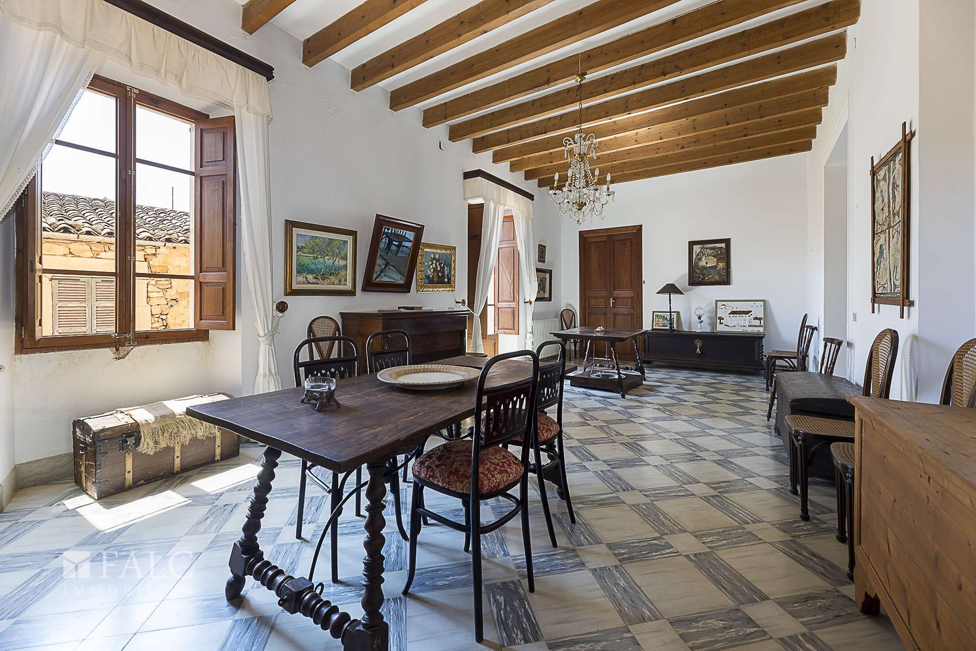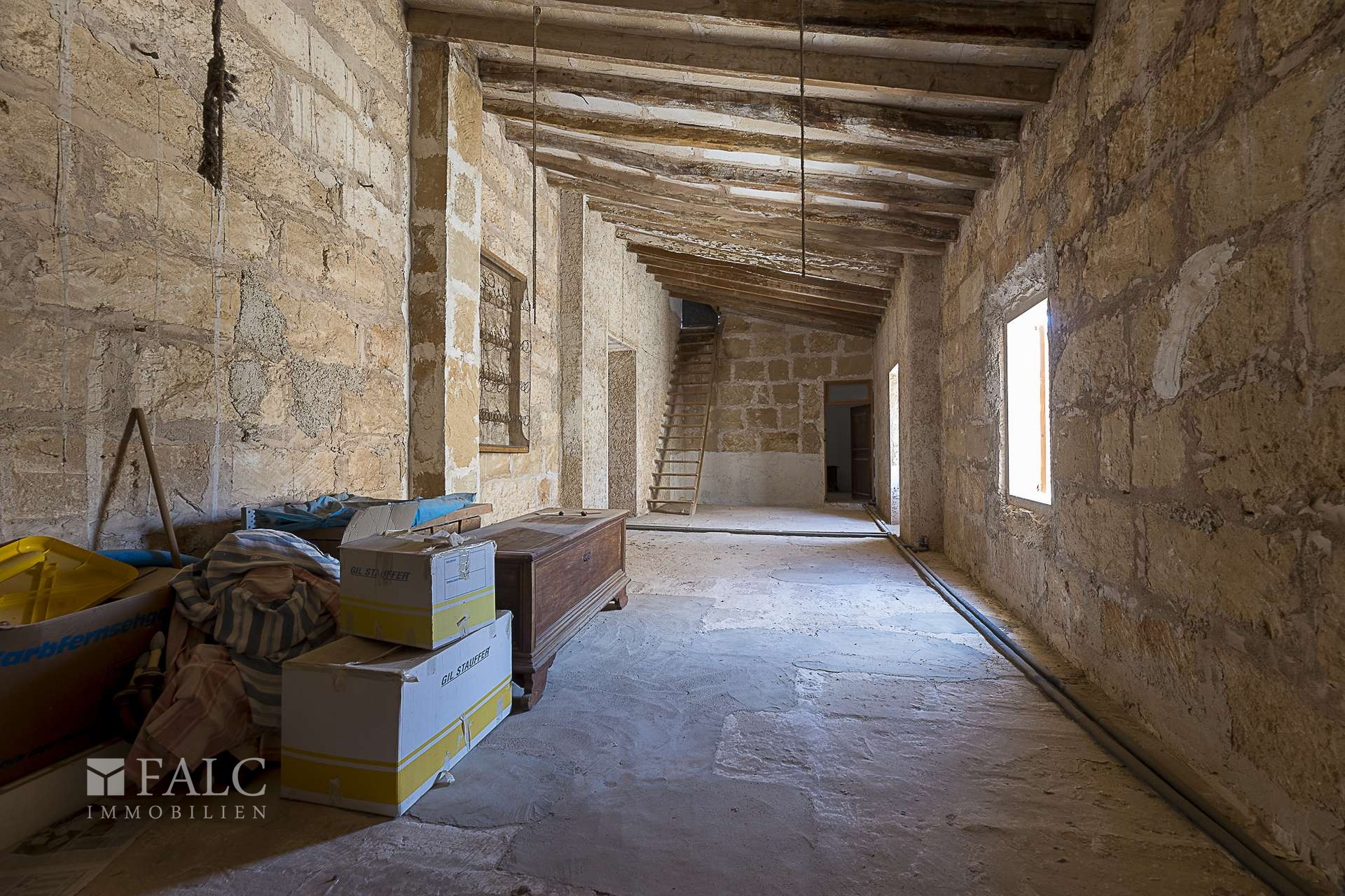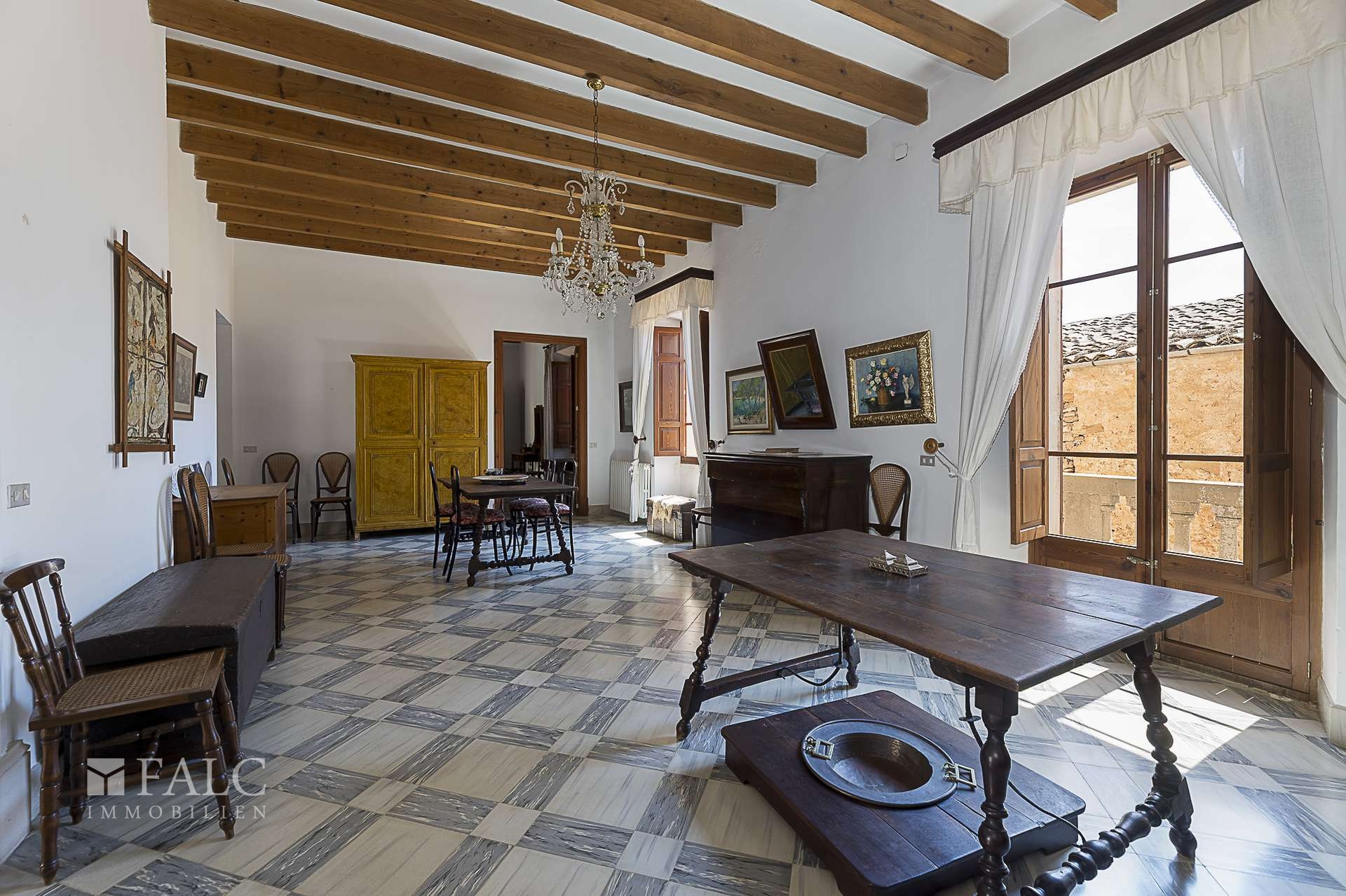 Das Haus besticht durch seine authentisch mallorquinische Bauweise, erhaltene Originalelemente wie sichtbare Holzbalken und hohe Decken verleihen dem Objekt einen besonderen Charme. Sechs Schlafzimmer, drei Badezimmer, eine separate Küche sowie ein weitläufiger Wohn- und Essbereich schaffen eine ideale Basis für komfortables Wohnen oder stilvolle Gästeunterbringung.