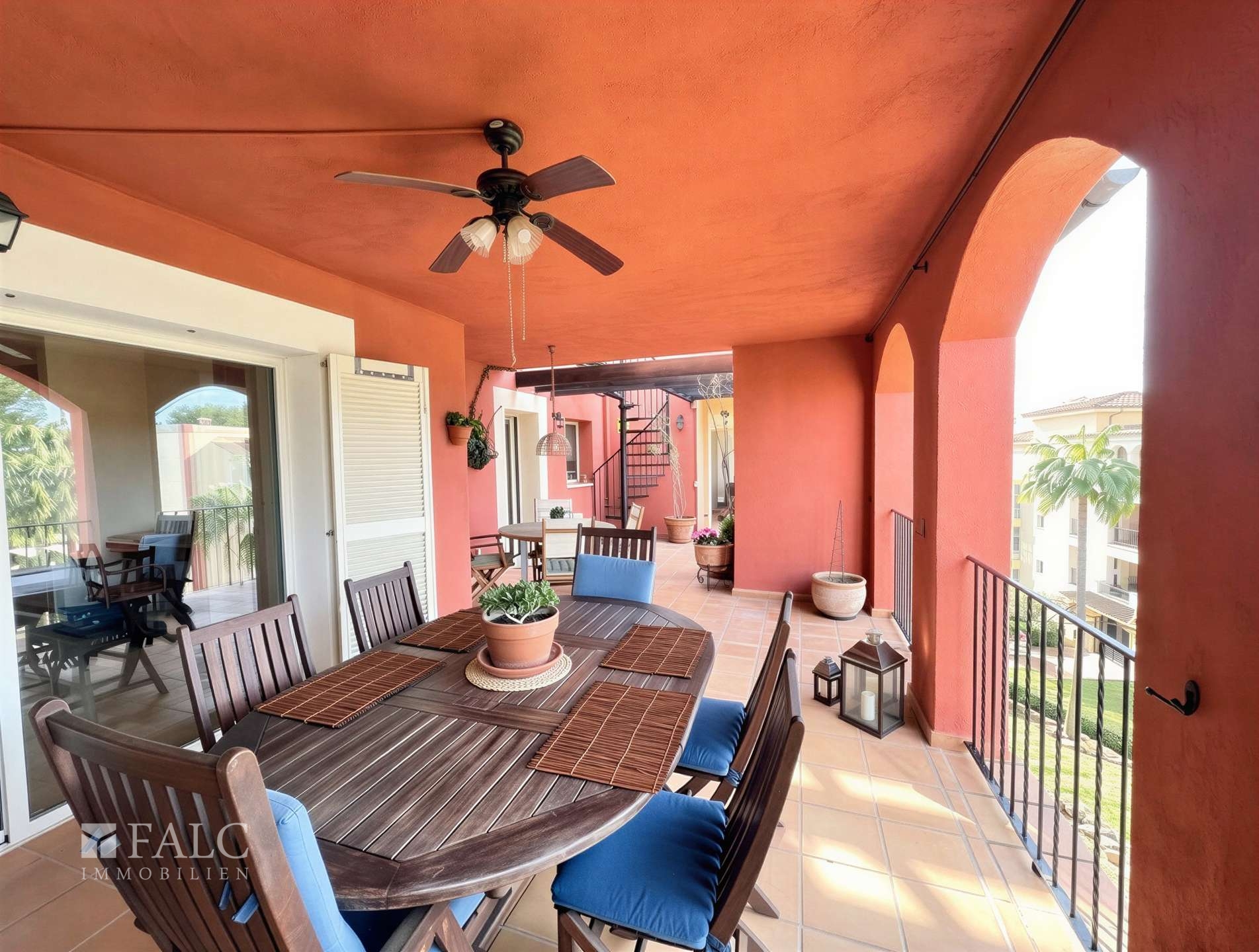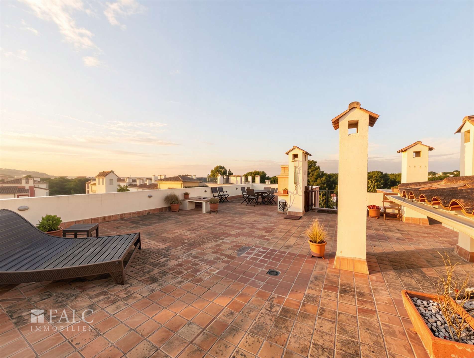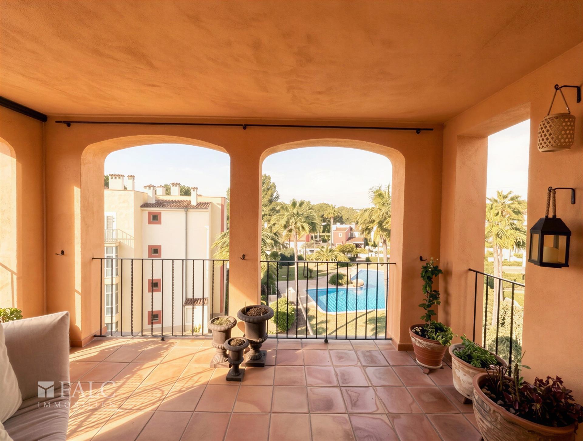 Ein besonderes Highlight sind die außergewöhnlichen Außenflächen: Vier Balkone mit insgesamt ca. 59 m² erweitern die Wohnräume ins Freie. Die großzügige Hauptterrasse lädt zu entspannten Stunden mit Blick ins Grüne ein. Über allem thront die beeindruckende, ca. 143 m² große Dachterrasse – ein privates Refugium mit Meerblick, das seinesgleichen sucht. Hier entstehen Sonnenuntergänge über dem Mittelmeer, stilvolle Dinnerabende unter freiem Himmel oder exklusive Empfänge mit Blick über die Fairways. Die Verbindung aus dem satten Grün des Golfplatzes und dem tiefen Blau des Meeres schafft eine Kulisse von außergewöhnlicher Schönheit.