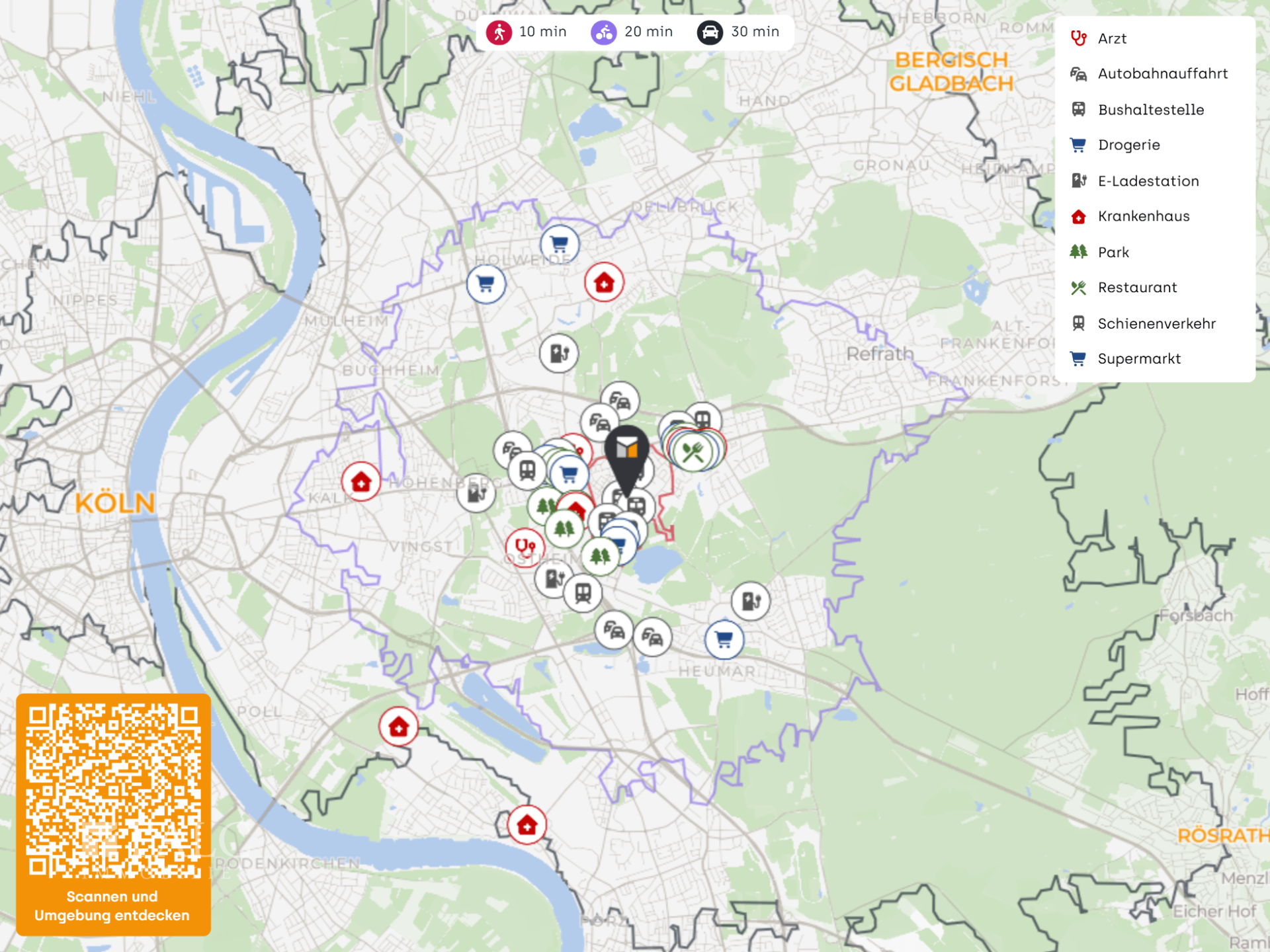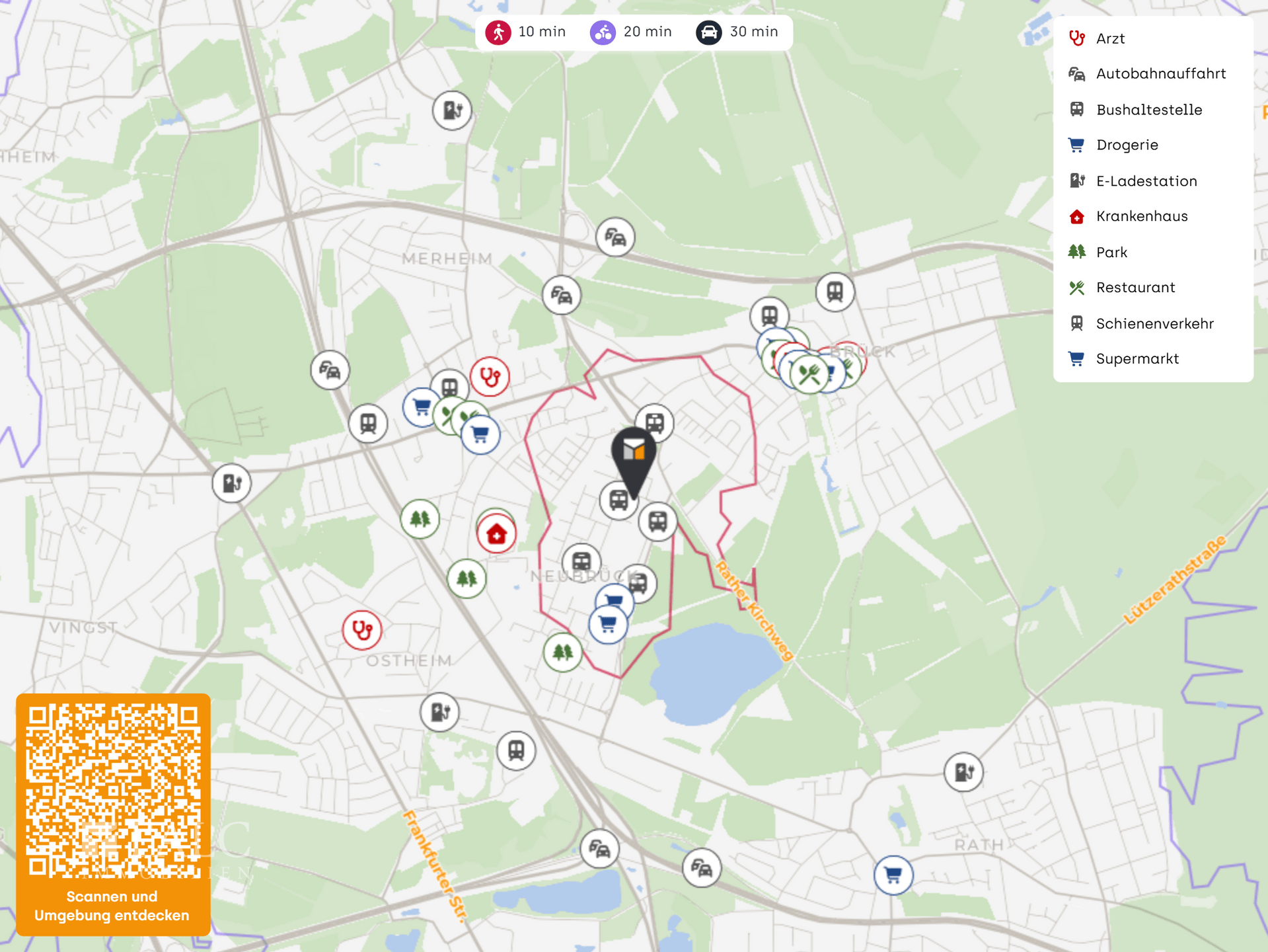 Die Immobilie befindet sich in einer gut angebundenen Lage in Köln, die sowohl für Familien als auch für Berufstätige attraktiv ist. Die Anbindung an den öffentlichen Nahverkehr ist hervorragend, mit mehreren Bushaltestellen in unmittelbarer Nähe, darunter die Haltestelle Europaring, die nur wenige Gehminuten entfernt ist. Die Tram-Station Merheim ist ebenfalls schnell erreichbar und bietet eine bequeme Verbindung in die Innenstadt.