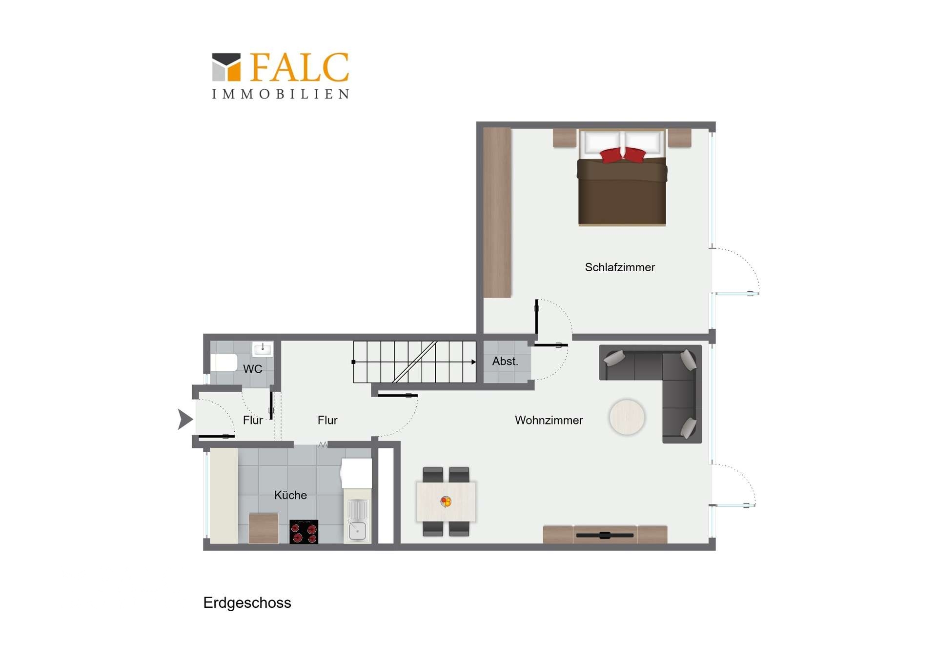 Im Erdgeschoss befindet sich zudem ein Schlafzimmer, das sich ideal als Gäste- oder Arbeitszimmer nutzen lässt. Der Zugang zum Obergeschoss erfolgt über eine Treppe im Flur.