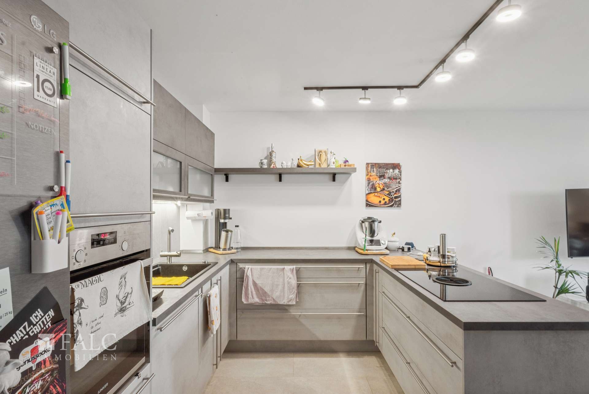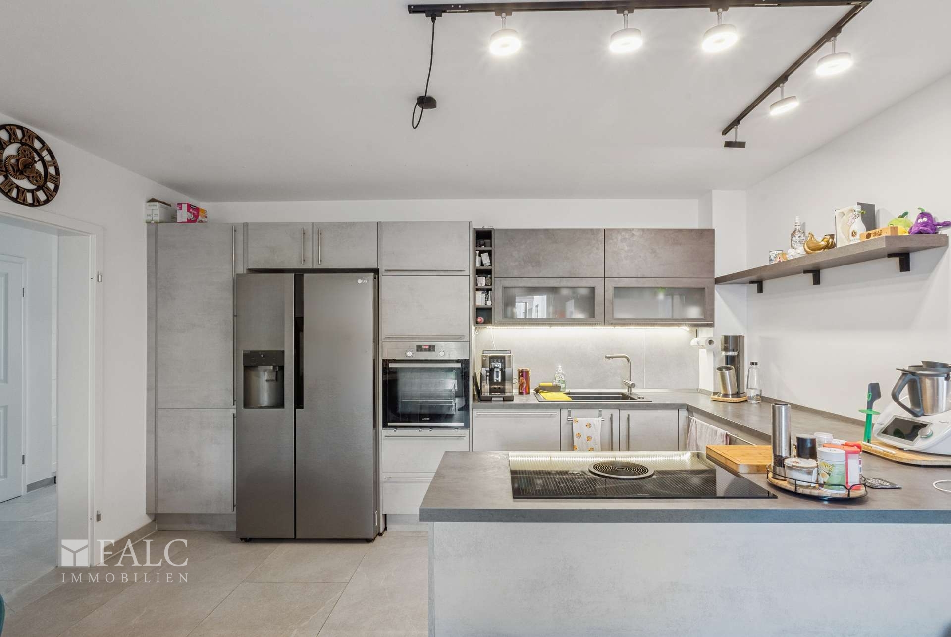 Vom Flur aus gelangt man in das helle, geräumige Wohnzimmer. Herzstück ist die hochwertige Nobilia-Einbauküche mit modernen Elektrogeräten: Induktionskochfeld mit vier Zonen, integrierter Dunstabzug, neuer Spüle mit Brita-Filter sowie ein Side-by-Side-Kühlschrank. Eine Küche, die nicht nur funktional überzeugt, sondern auch optisch einen klaren Akzent setzt – ideal für gemeinsame Kochabende und gesellige Runden.