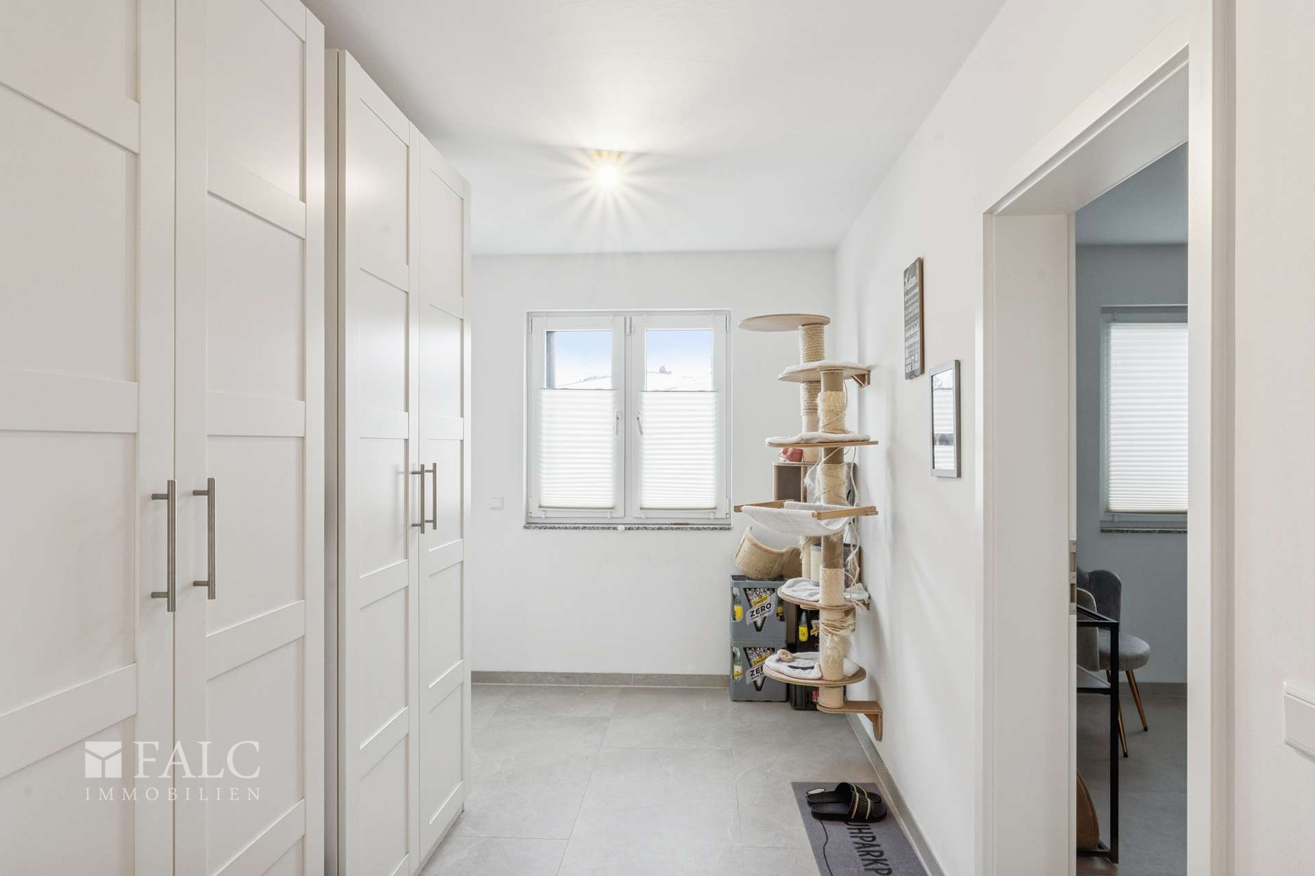 Ein weiteres Zimmer bietet sich perfekt als Büro, Gästezimmer oder Hobbyraum an. Auch hier sind Plissees, Fliegenschutz und Smart-Home-Steuerung bereits vorhanden.