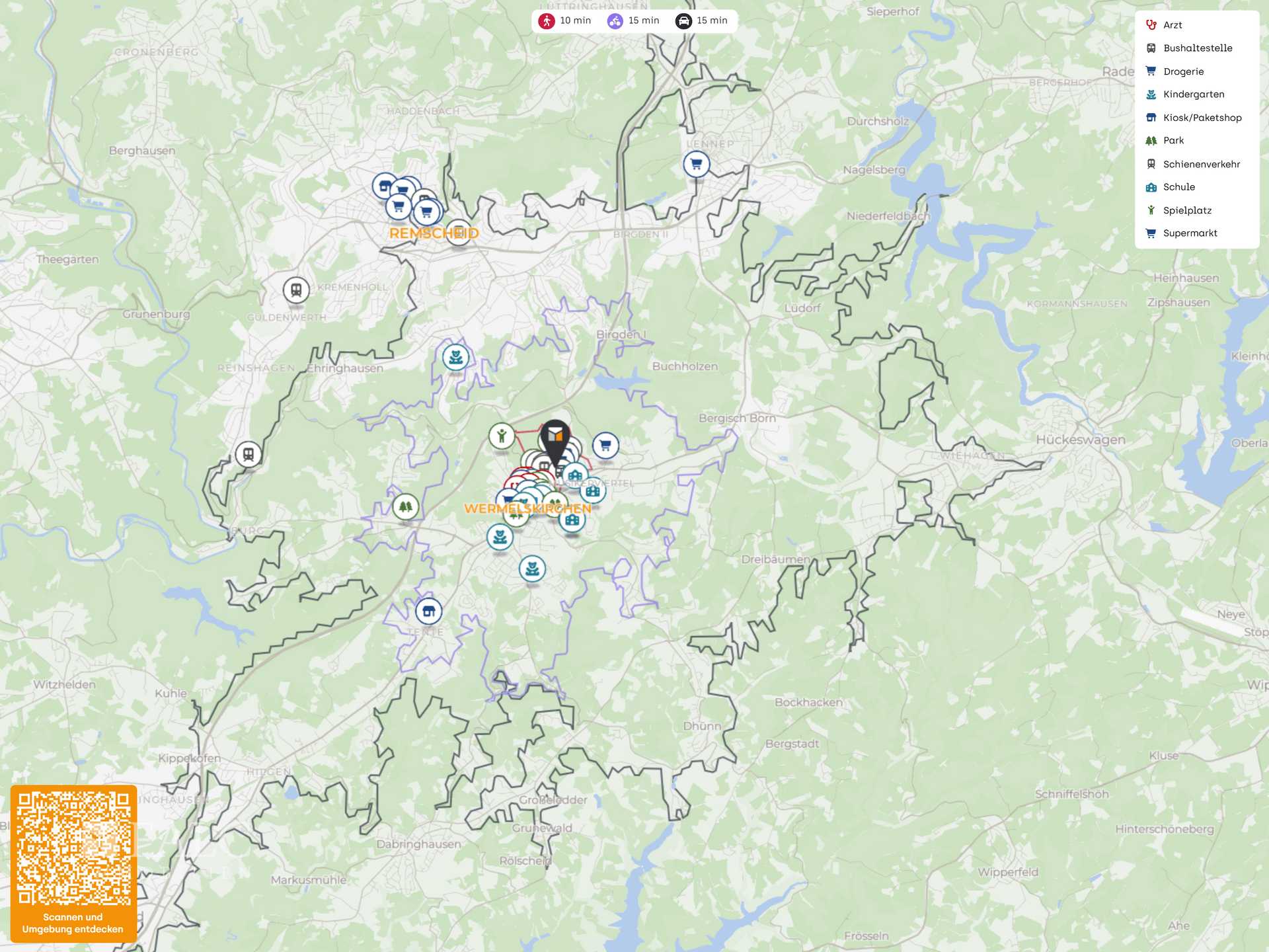 Familien profitieren von einem breiten Angebot an Betreuung und Bildung in der Umgebung. Der DRK Kindergarten Wunderwelt liegt in ca. 600 m, die Sekundarschule Wermelskirchen in ca. 500 m. Ergänzend sind weitere Schulen und Kitas in der näheren Umgebung vorhanden, was den Standort im Alltag spürbar entlastet.
