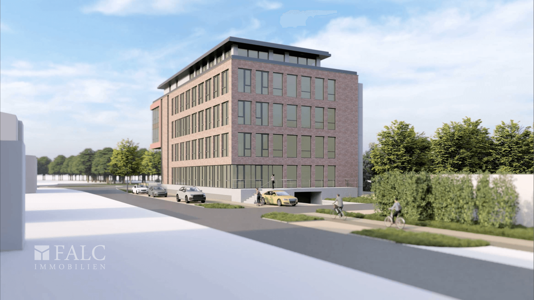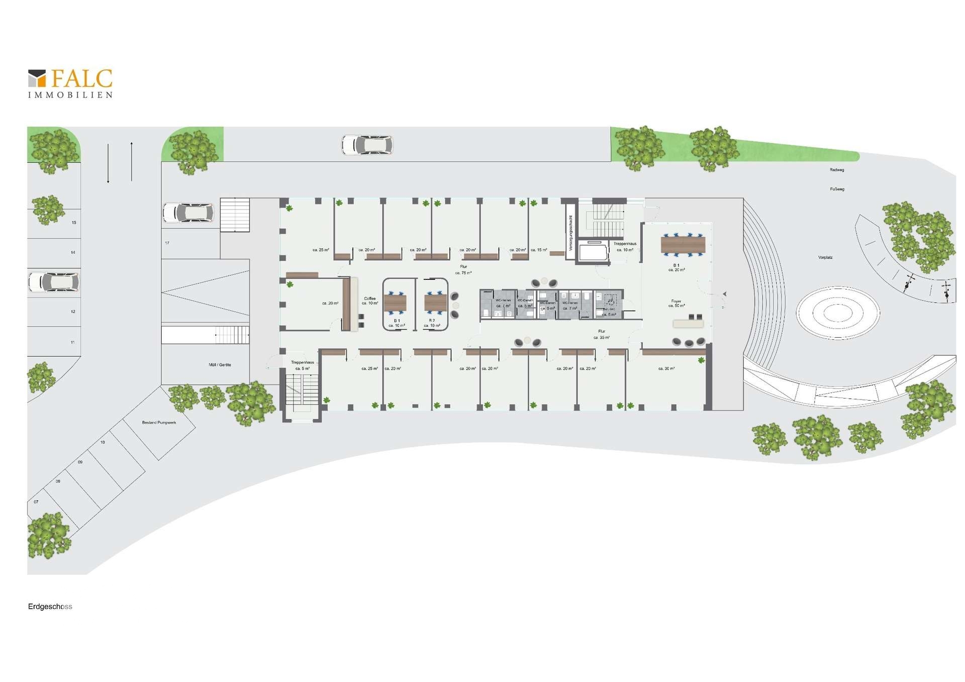 Umfeld & Image: Durch das geplante architektonische Gesamtkonzept entsteht eine eigenständige, moderne Adresse mit repräsentativem Eingang, hochwertiger Fassadengestaltung und sichtbarer Präsenz an der Steinstraße. Das entstehende Umfeld wird durch durchdachte Vorplatz- und Grünflächenplanung sowie eine klare Wegeführung aufgewertet — ideal für Unternehmen, die hochwertige, flexible Büroflächen in einer gut erreichbaren, städtischen Lage suchen.