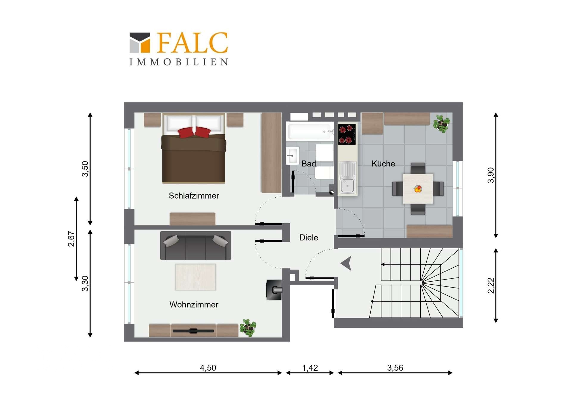 Rechte Seite jeder Etage: 2 Zimmer, Wohnküche und Badezimmer – ideal für Paare oder kleine Familien