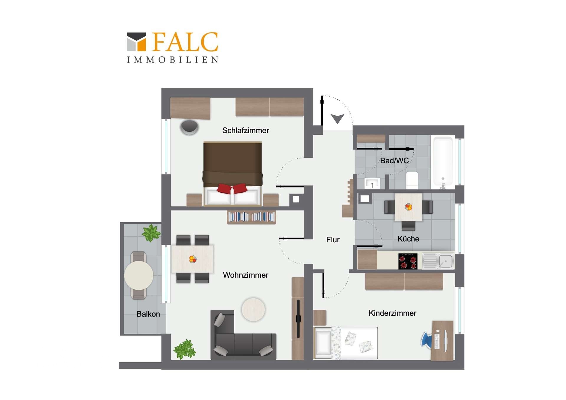 Gleich links vom Eingang befindet sich das geräumige Wohnzimmer. Große Fenster lassen viel Tageslicht herein und schaffen eine angenehme Atmosphäre. Von hier aus gelangen Sie auf den Balkon, der sich ideal für entspannte Stunden im Freien eignet.