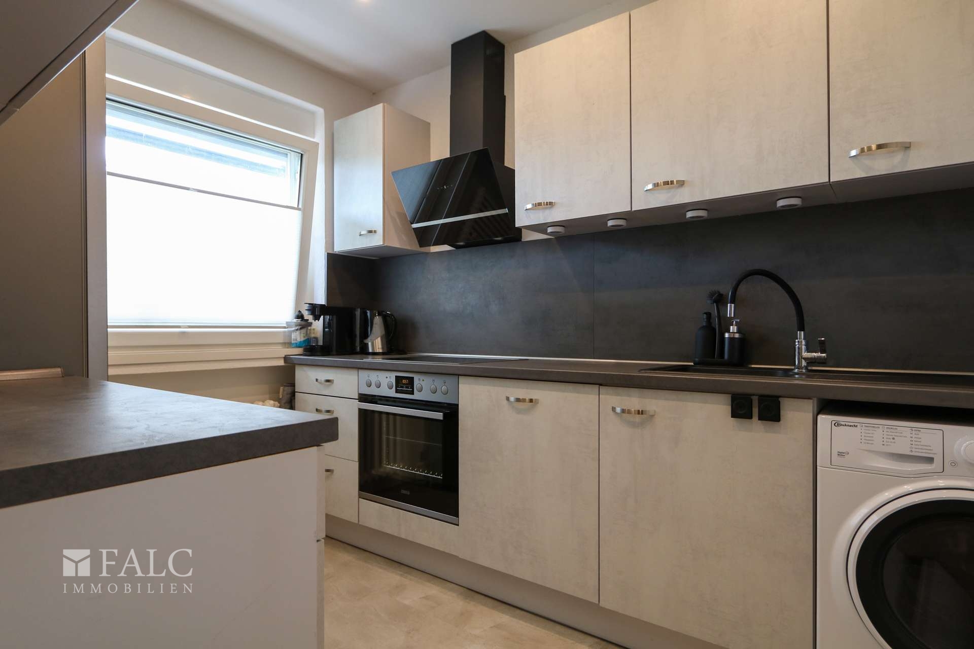 - Fußböden: helles Klickvinyl in Holzoptik in der Diele, Wohn- und Schlafzimmer, in der Küche anthrazitfarben, im Bad Fliesenboden.