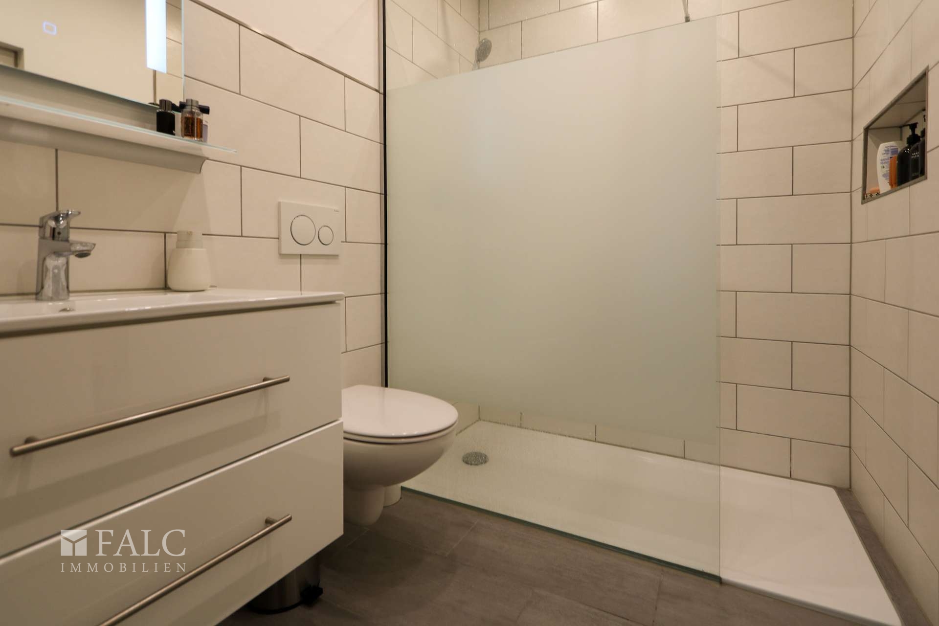 - Duschbad: (2020/21 komplett modernisiert) Waschtisch mit Unterschrank, Hänge WC, große Regendusche mit zusätzlichem Brauseschlauch, Glastrennwand, Handtuchheizkörper, beleuchteter Wandspiegel, weiße, großformatige Wandfliesen und anthrazitfarbene Bodenfliesen.