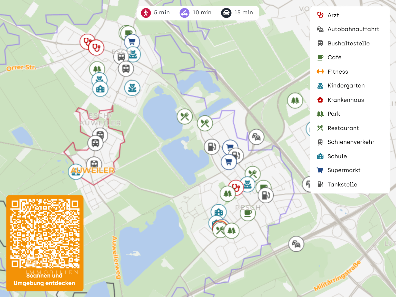 Die Auweilerstraße liegt in einer verkehrsberuhigten Wohnlage mit überwiegend Ein- und Zweifamilienhäusern. Die unmittelbare Umgebung ist von Feldern und landwirtschaftlichen Flächen geprägt, wodurch ein hohes Maß an Ruhe, Privatsphäre und Erholungswert gewährleistet ist.