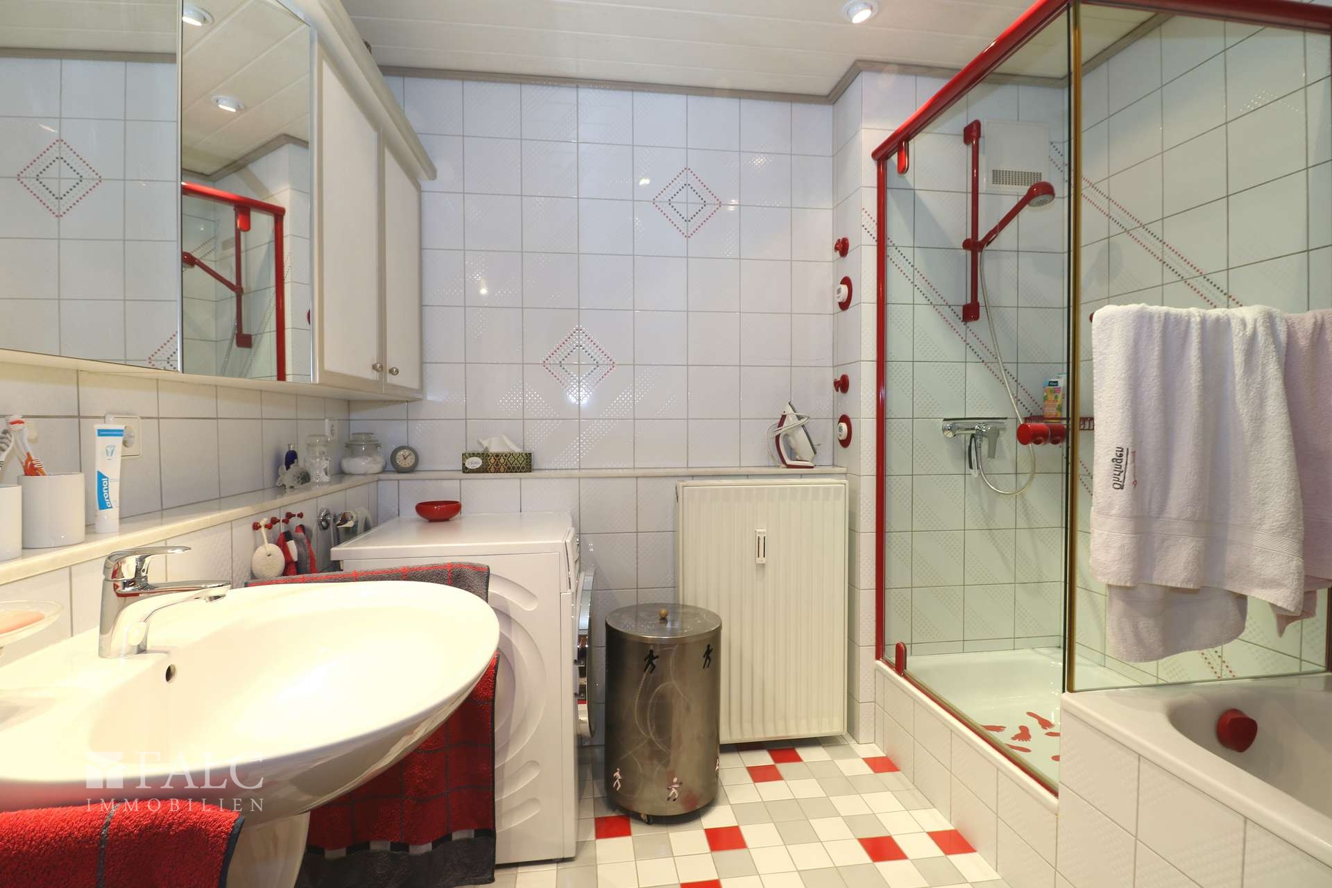 - Bad mit Badewanne, Dusche, Waschtisch und Waschmaschinenstellplatz
