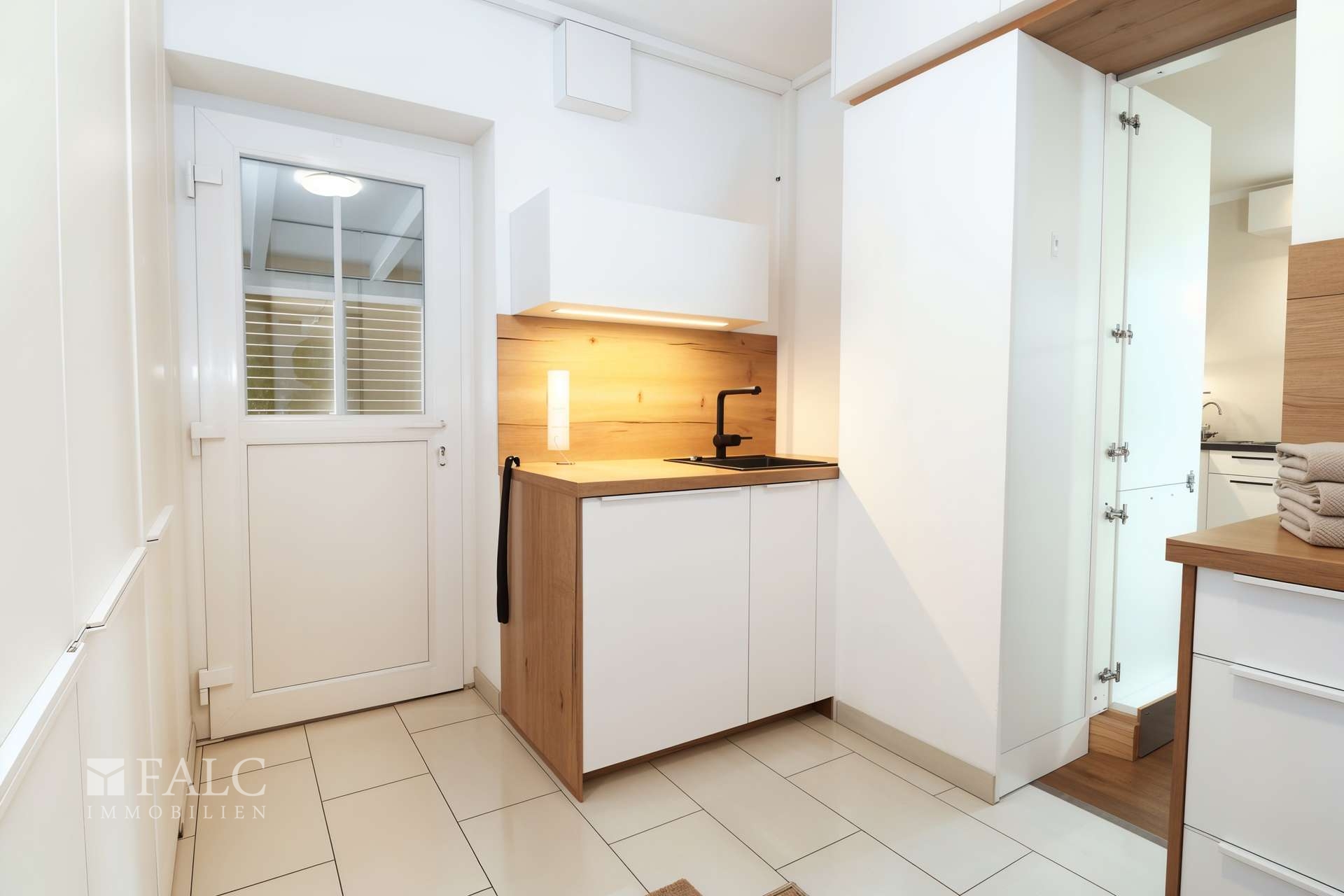 Raffiniert und durchdacht ist der versteckte Durchgang, der unauffällig in einen Küchenhochschrank integriert ist: Dahinter gelangen Sie direkt in den Hauswirtschafts- und Haustechnikraum. Hier finden Waschplatz, Vorräte und alles, was man im Alltag gerne „aus dem Blick“ hat, ihren festen Platz. Einbauschränke sorgen für Ordnung, und ein zusätzliches Waschbecken ist besonders praktisch nach der Gartenarbeit. Über den direkten Ausgang nach draußen erreichen Sie bequem den Außenbereich bzw. den Anbau.