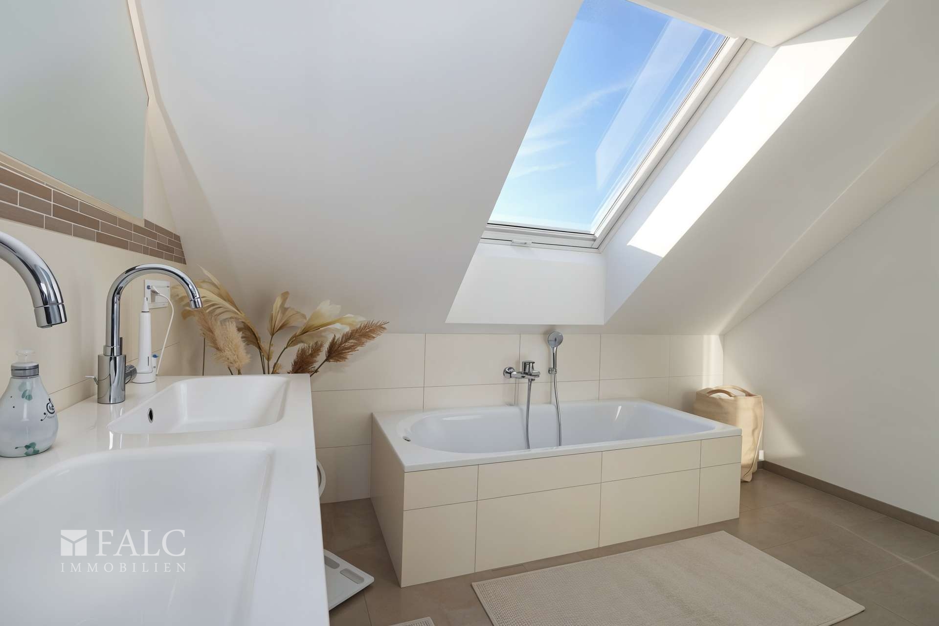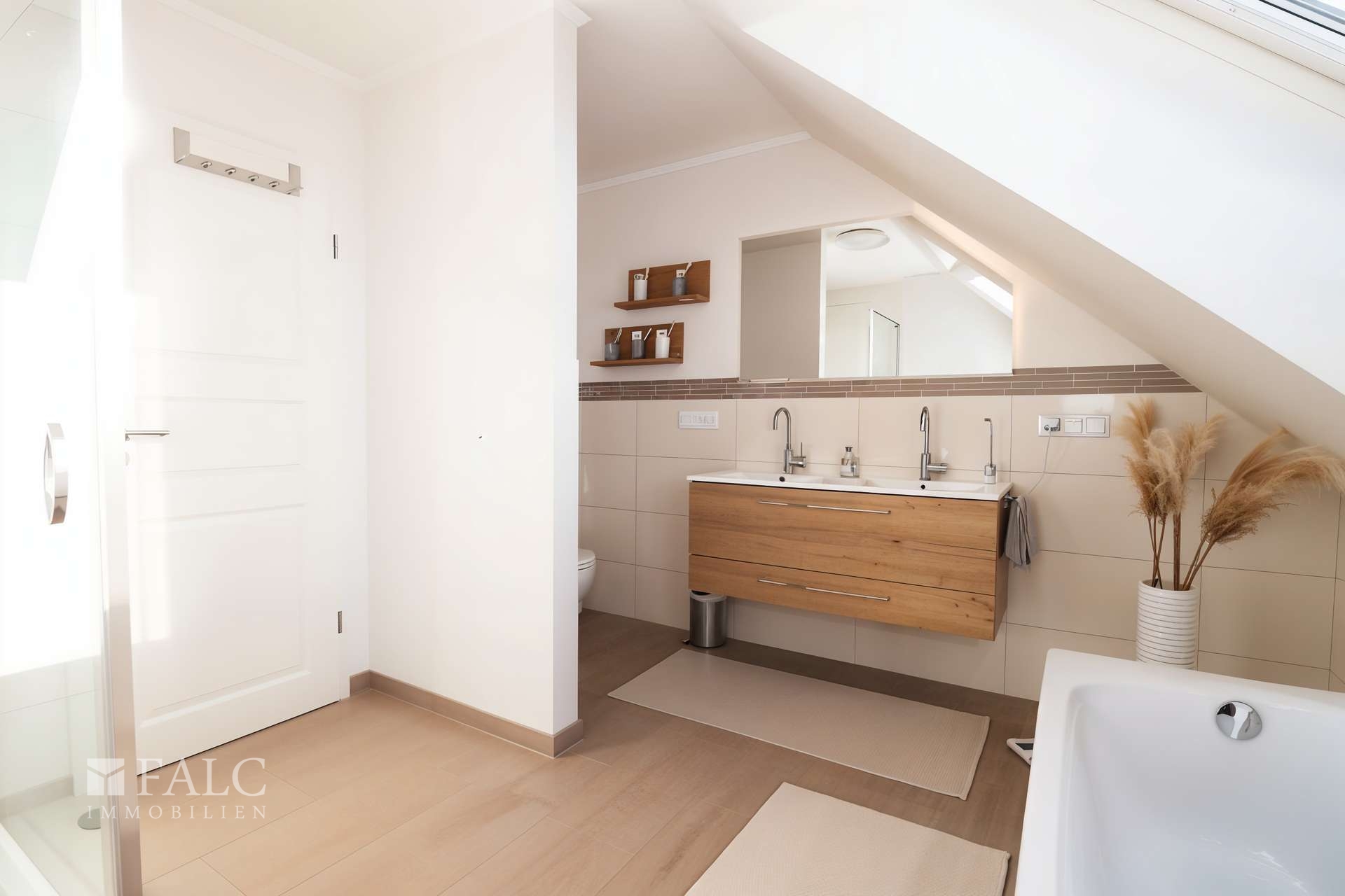 - modernes Tageslichtbad mit Doppelwaschtisch, bodenebene Dusche, Badewanne und WC