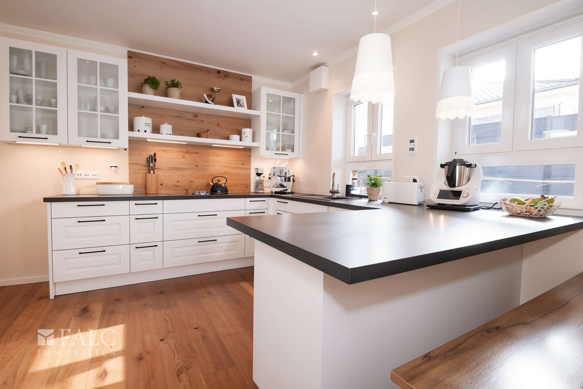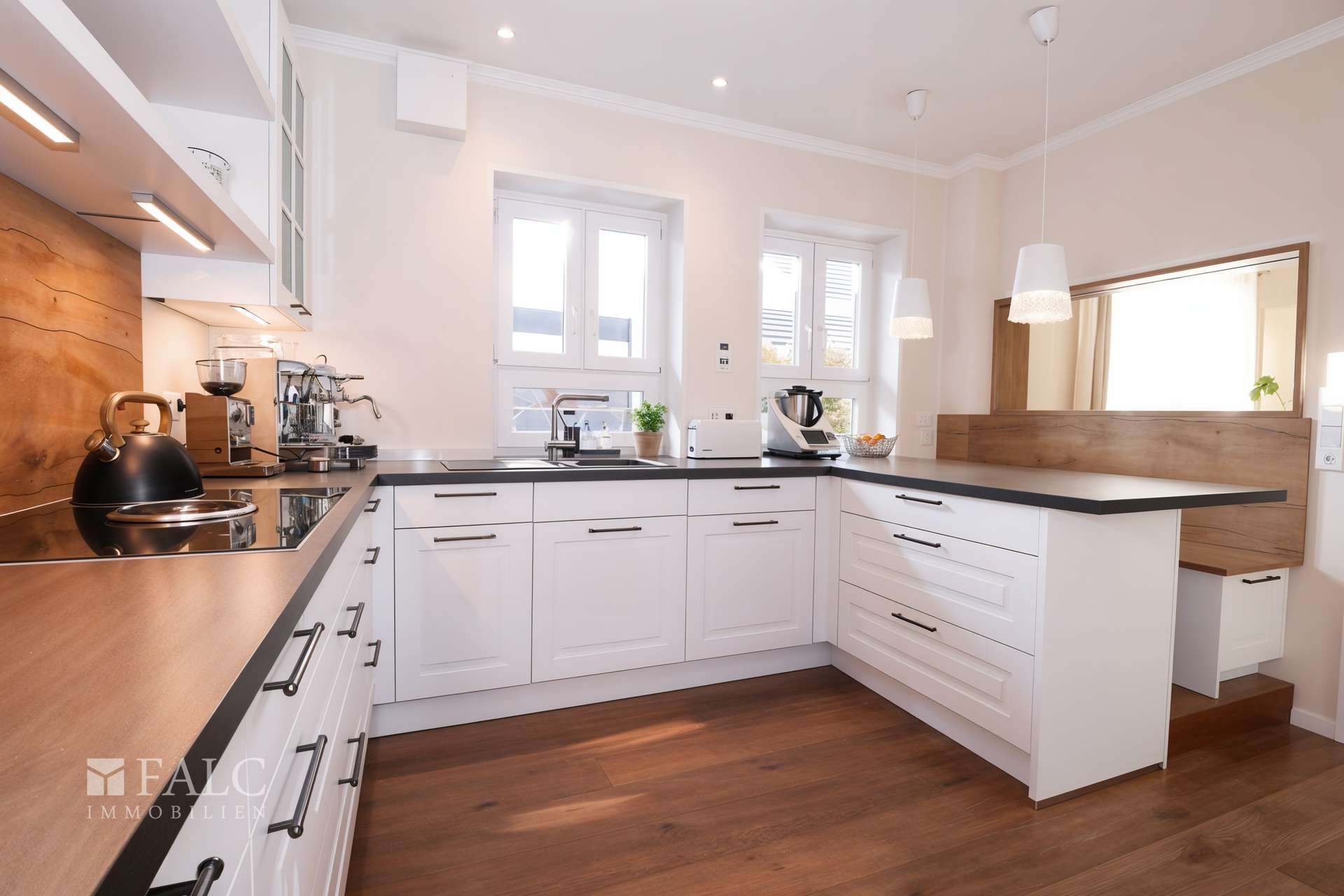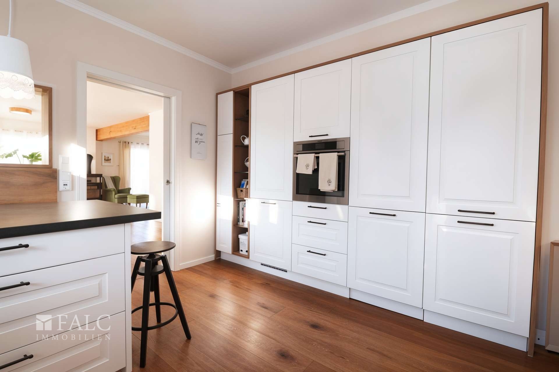 Die Küche ist über eine Schiebetür vom Essbereich abgetrennt, bleibt gleichzeitig durch ein Sichtfenster verbunden. Hier erwartet Sie eine hochwertige Einbauküche mit Markengeräten, viel Arbeitsfläche und durchdachtem Stauraum. Besonders praktisch im Alltag: An der Arbeitsplatte ist eine Sitzbank integriert – ideal für den schnellen Kaffee am Morgen oder als Platz für Gäste, während gekocht wird.