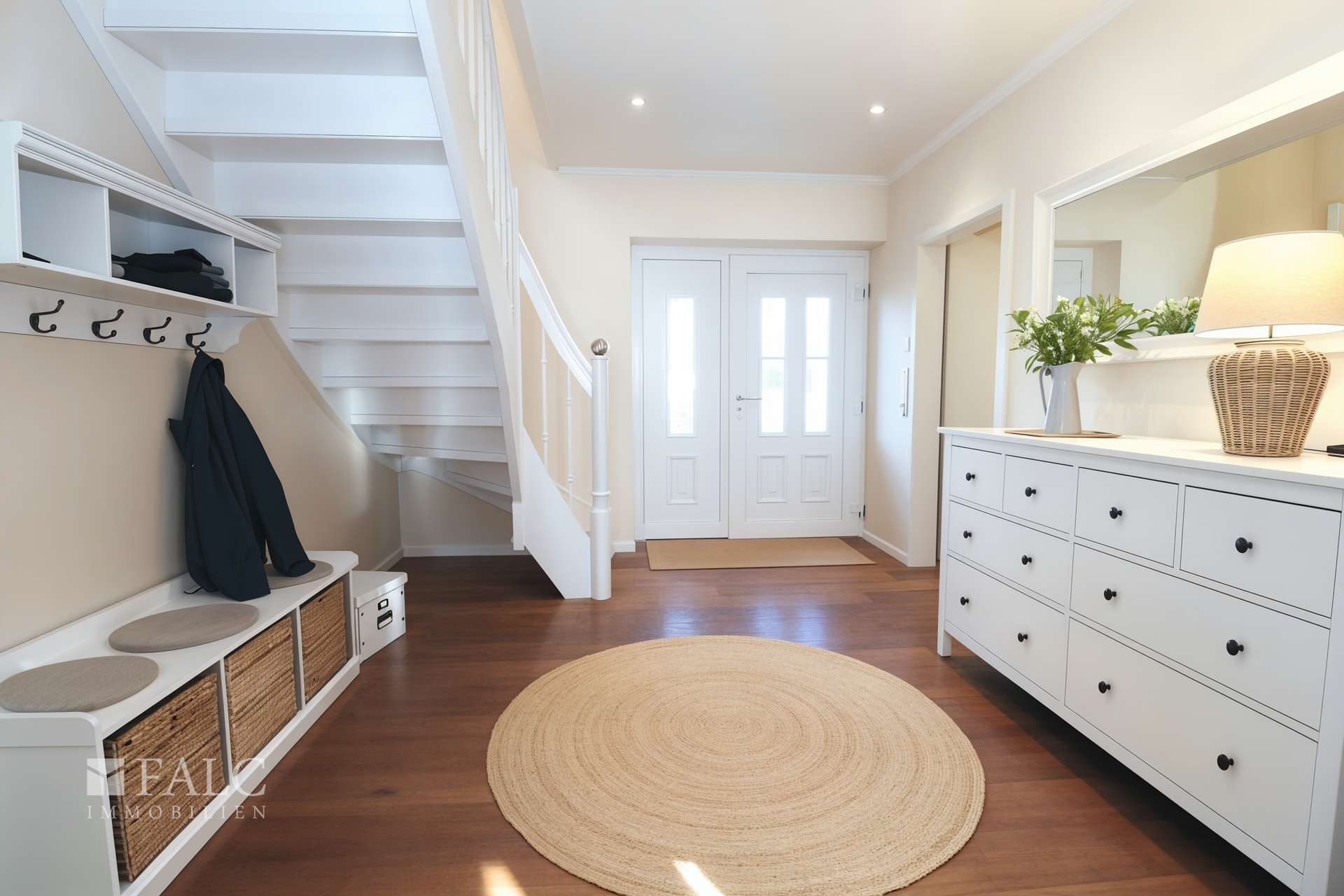 Das moderne Einfamilienhaus aus dem Jahr 2017 bietet rund 192 m² Wohnfläche und 5,5 Zimmer in einem durchdachten Grundriss. Sie betreten das Haus über den stilvollen Eingangsbereich und stehen in einer großzügigen Diele, die Platz für Ankommen und Alltag schafft. Direkt daneben liegt die Garderobe mit Einbauschränken – ideal für Jacken, Taschen und Schuhe. Ein Duschbad mit WC im Erdgeschoss ist praktisch für Gäste oder den schnellen Start in den Tag.