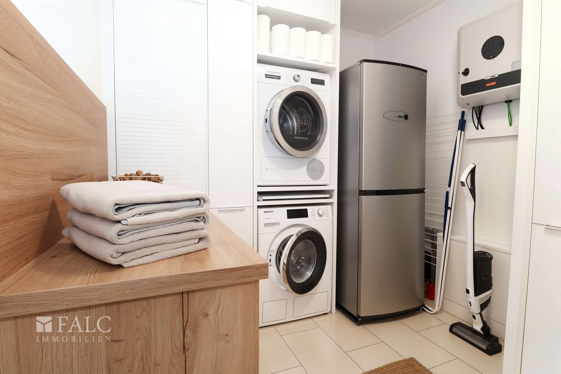 - versteckter Durchgang zum Haustechnik- und Hauswirtschaftsraum, mit praktischen Einbauschränken, separater Waschtisch mit Gefrierschrank, Zugang zum Außenbereich/Anbau