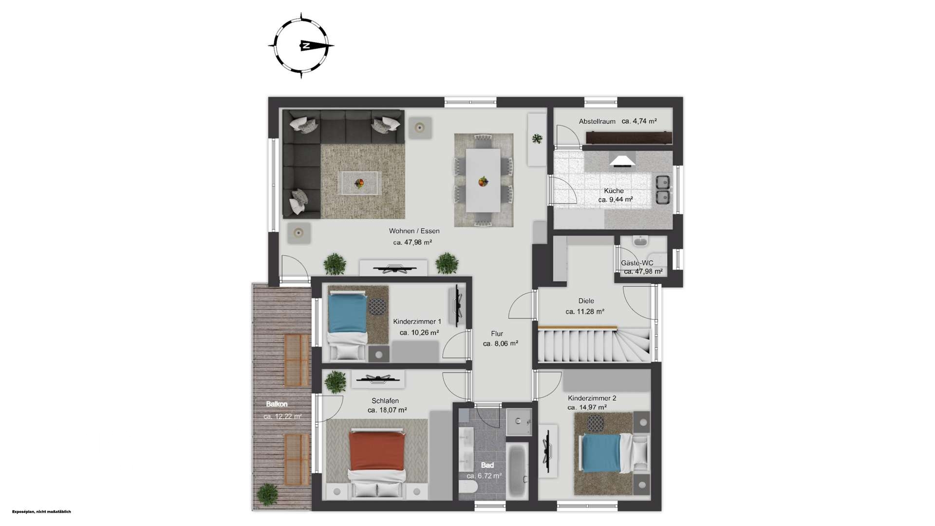 Im Erdgeschoss empfängt Sie ein Dielenbereich mit Garderobe, der die Stockwerke angenehm verteilt und zugleich den Zugang zum separaten Gäste-WC ermöglicht. Direkt anschließend öffnet sich der großzügige Wohn- und Essbereich, der mit seiner Weite und dem fließenden Übergang zwischen den Bereichen eine einladende Wohnatmosphäre schafft. Hier lässt sich bei Bedarf ein Schwedenofen ergänzen, der den Raum um eine zusätzliche, gemütliche Komponente bereichert. Der Küchenbereich ist aktuell separat gehalten, kann aber auch unkompliziert geöffnet werden. Hier können sich Ihre Gestaltungsideen austoben. Eine Speisekammer sorgt für zusätzlichen Stauraum und kurze Wege im Alltag. Besonders schön ist der direkte Zugang auf den großen, überdachten Süd-Balkon, den auch das Elternschlafzimmer erreicht, sodass Innen- und Außenbereich harmonisch ineinandergreifen und die Räume eine freundliche Weite erhalten. Ebenfalls auf dieser Ebene liegen das Elternschlafzimmer sowie zwei weitere Zimmer, die sich flexibel als Kinderzimmer, Büro oder Gästezimmer nutzen lassen, ergänzt durch ein Tageslichtbad mit Badewanne.