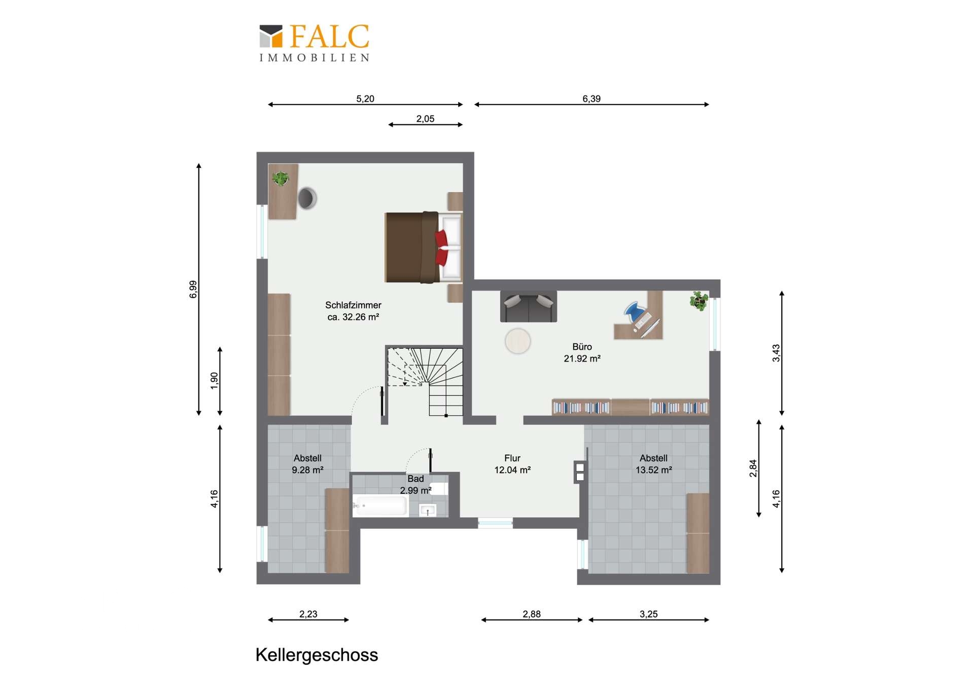 Im Kellergeschoss liegt der private Rückzugsbereich, der die vier Zimmer sinnvoll ergänzt und Raum für Schlafen, Arbeiten oder Gäste schafft. Das Schlafzimmer wirkt großzügig geschnitten, während ein weiteres Zimmer sich gut als Büro oder Kinderzimmer anbietet und damit unterschiedliche Lebenssituationen abdeckt. Das Badezimmer ist als eigenständiger Funktionsraum vorhanden und rundet die Etage alltagstauglich ab, ohne den Wohnbereichen Fläche zu nehmen. Ergänzend schaffen verschiedene Abstellflächen und Nutzräume Ordnung.