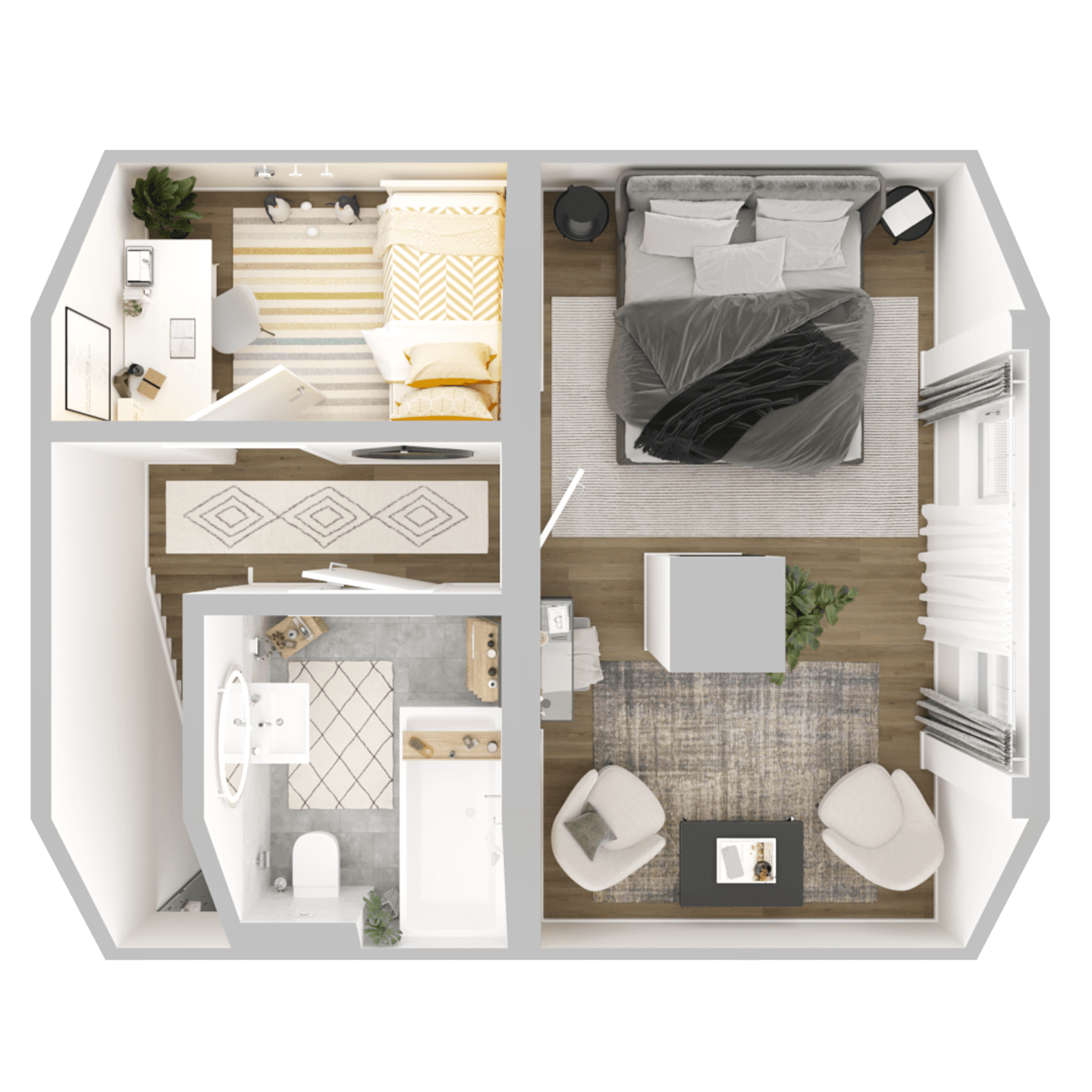 Im Obergeschoss verteilen sich zwei weitere helle Zimmer und ein modernes Wannenbad. Die Räume sind freundlich gestaltet, mit weißen Wänden und modernen Fußböden, wodurch ein zeitloses und einladendes Ambiente entsteht. Eines der Schlafzimmer verfügt auch hier über einen separaten Kamin, sodass hier ebenfalls eine behagliche Atmosphäre möglich ist. Der Spitzboden bietet zusätzlichen Stauraum.
