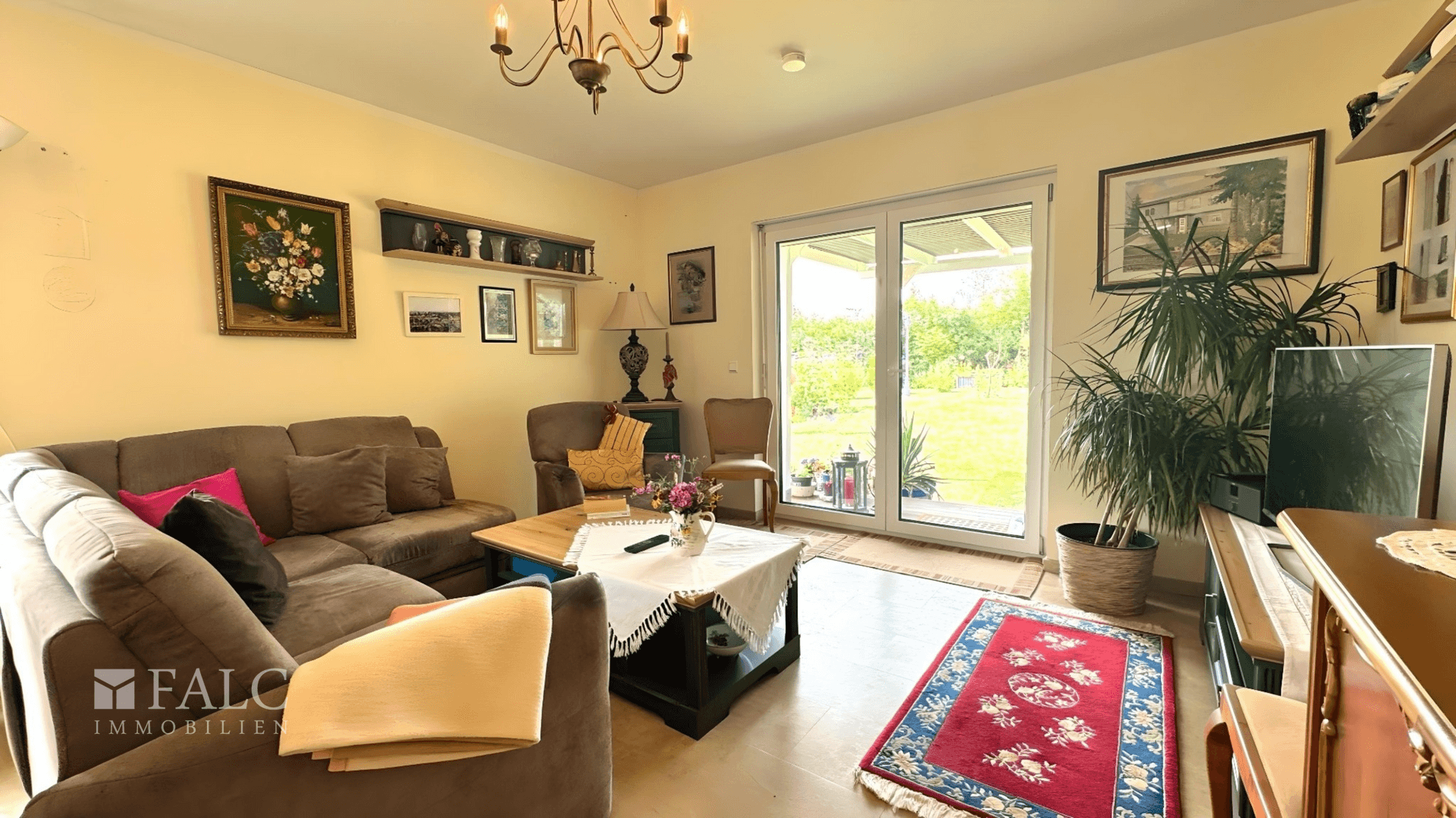 * Wohnzimmer mit großen, bodentiefen Fenstern