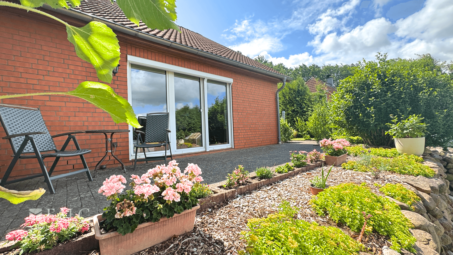 * Sonnenterrasse mit unverbautem Blick ins Grüne