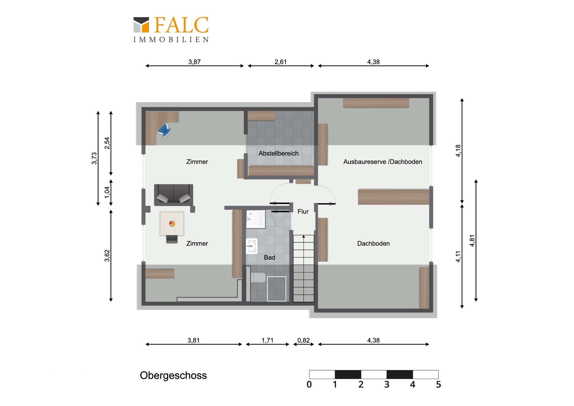 Das Obergeschoss beherbergt ein sehr großes, bereits ausgebautes und helles Zimmer, das sich durch seine Größe optimal in Wohn- und Schlafbereich unterteilen lässt. Eine große Abstellnische ergänzt diesen Bereich ideal. Zusätzlich steht im Obergeschoss ein Duschbad mit Fenster zur Verfügung. Eine Besonderheit ist die Ausbaureserve im Dachgeschoss, die Raum für zwei weitere Zimmer bietet. Ein kleiner Spitzboden sorgt für zusätzlichen Stauraum.