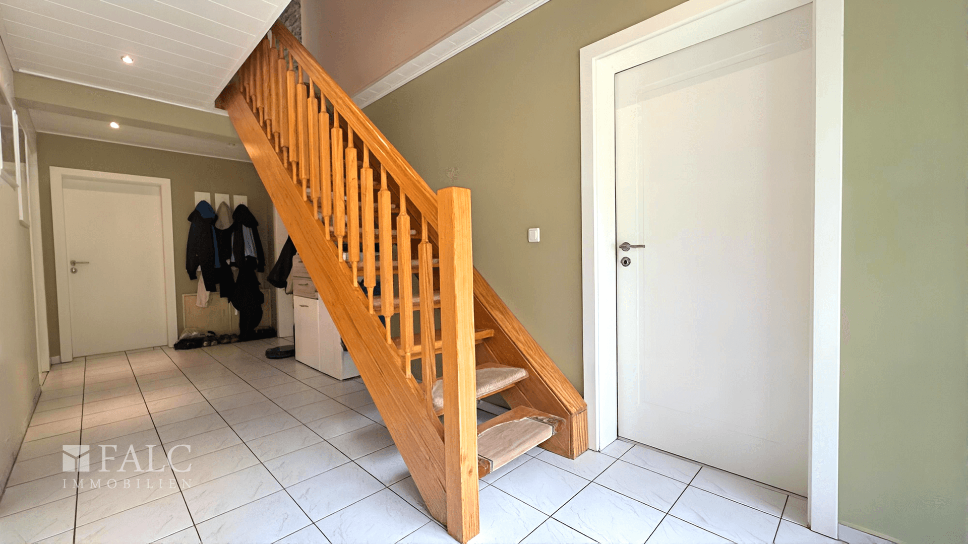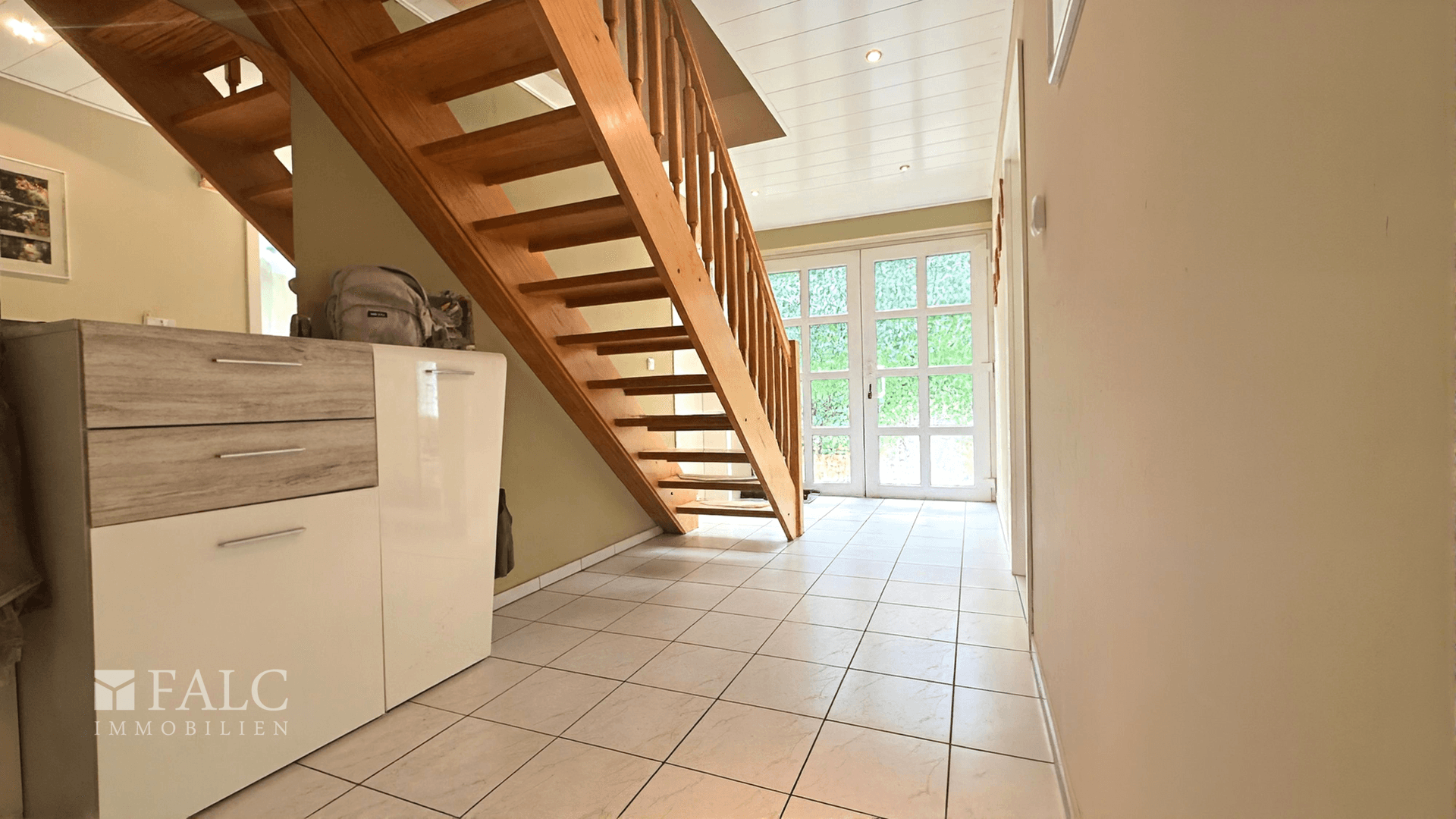 * Großer heller Eingangsbereich mit offener Holztreppe