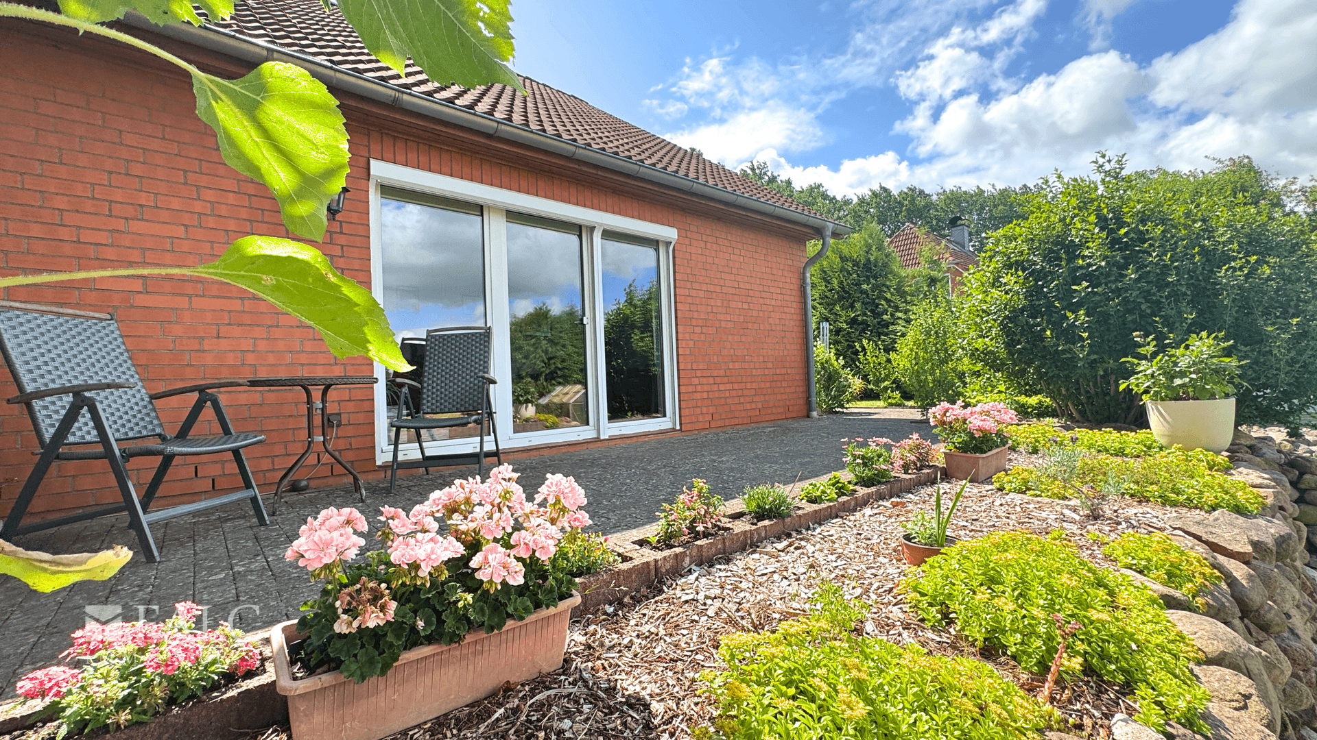 * Sonnenterrasse mit unverbautem Blick ins Grüne
