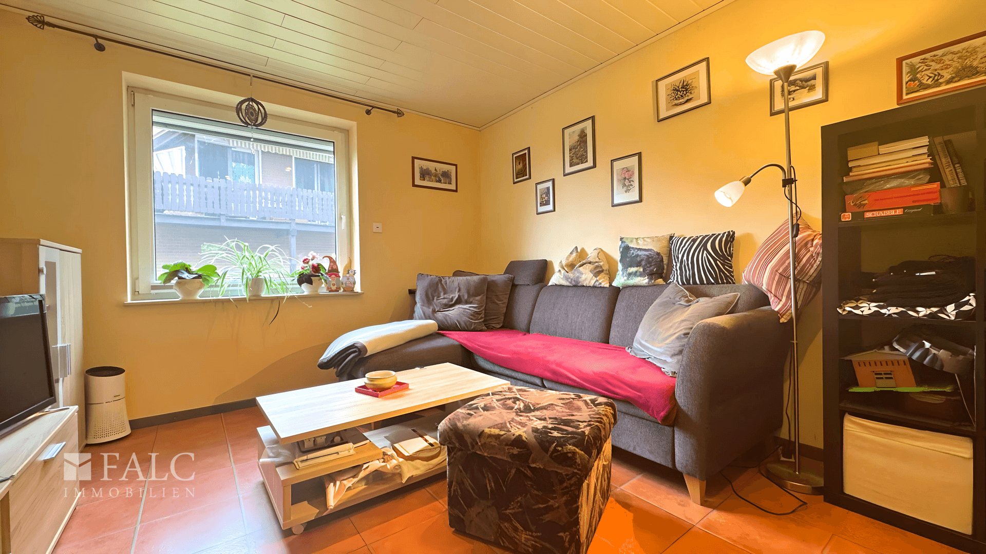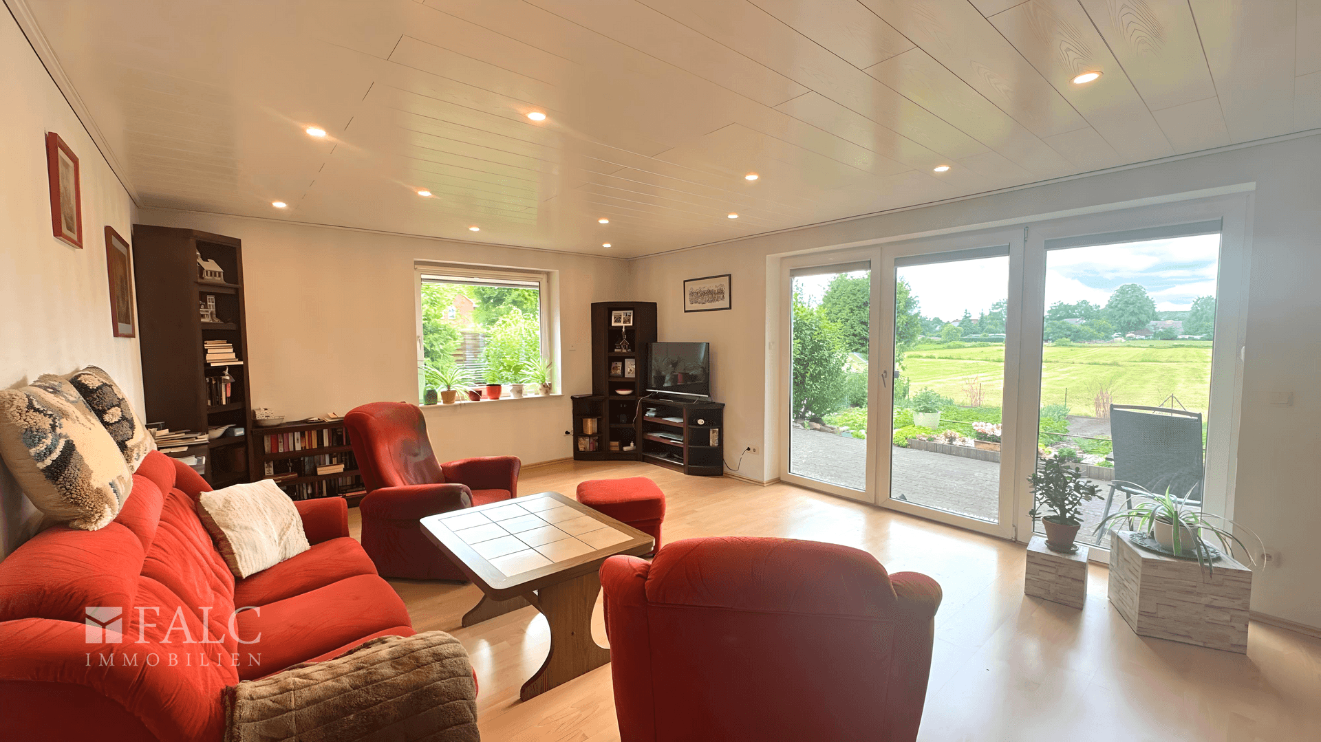 * Wohnzimmer mit bodentiefen Fenstern und Zugang zur Terrasse