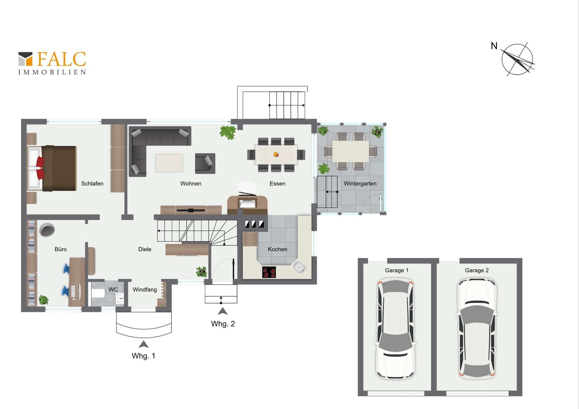 Diese großzügige Einheit erstreckt sich über das Erdgeschoss und Teile des Gartengeschosses. Allein im Erdgeschoss stehen ca. 94 m² Wohnfläche zur Verfügung – zusätzlich nutzbare Flächen im Gartengeschoss erhöhen den praktischen Mehrwert. Neben den Wohnräumen einem Gäste-WC und der Küche im Erdgeschoss befinden sich im Keller weitere Räume, sowie ein großes Badezimmer mit bodentiefer Dusche und Eckbadewanne. Nebenan befindet sich der Waschraum mit Anschlüssen für Waschmaschine und Trockner.Ein besonderes Highlight ist der lichtdurchflutete Wintergarten, der direkt an den liebevoll angelegten Außenbereich mit Terrasse und Garten anschließt.Zur Wohnung gehört eine Garage sowie zwei Stellplätze.