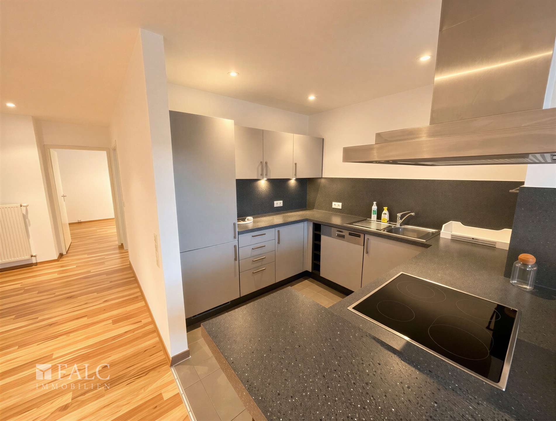 Die moderne Einbauküche fügt sich harmonisch in den Raum ein und gehört zur Wohnung.