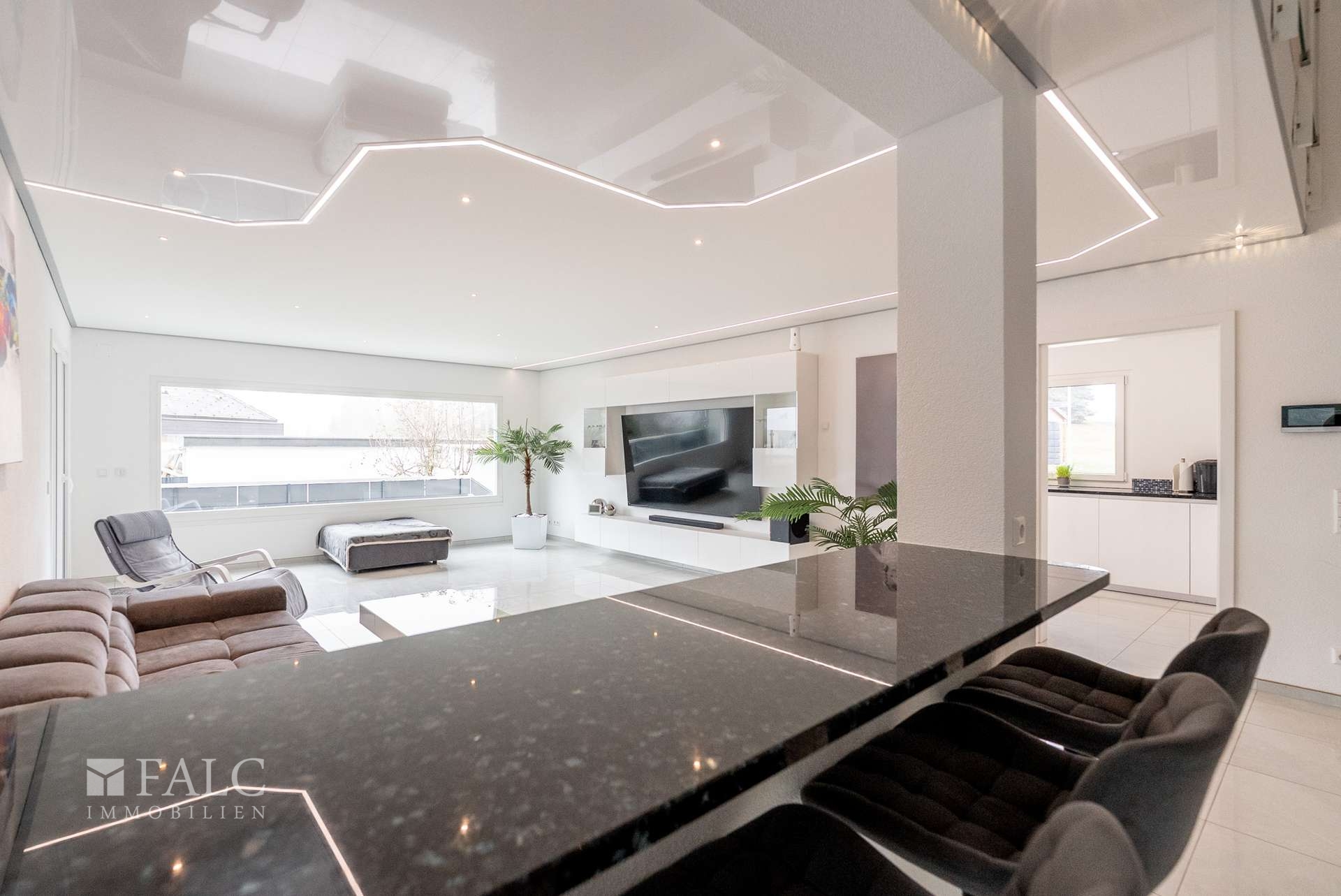 Ein besonderes Highlight im Erdgeschoss ist die kleine eingebaute Theke im Wohnbereich. Hier kann man seinen Snack oder Apperitif geniessen, bevor es weiter ins Esszimmer geht. Auch das Esszimmer erfreut mit einer großen Fensterfront, die Ausblick in den Garten und die Umgebung bietet,