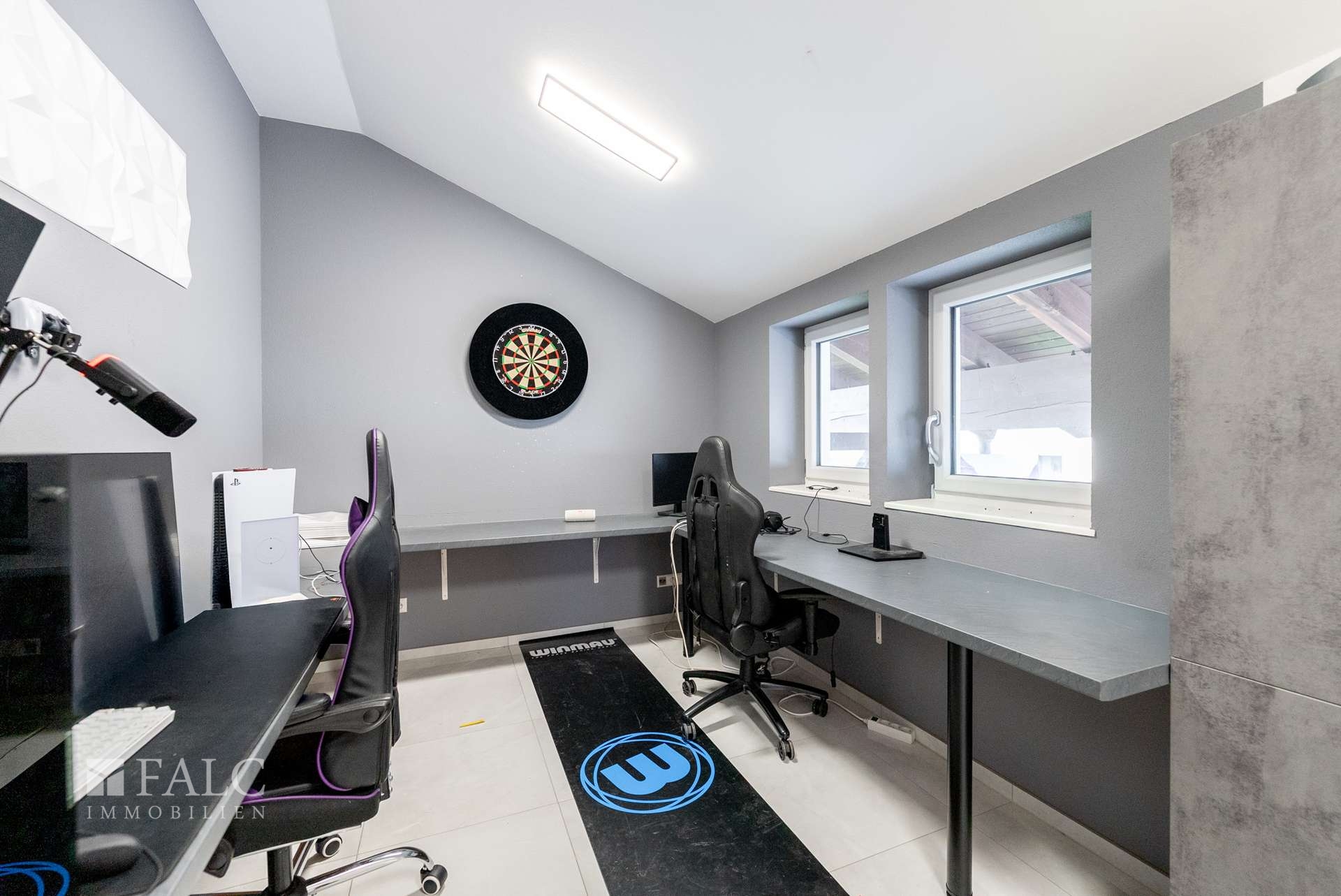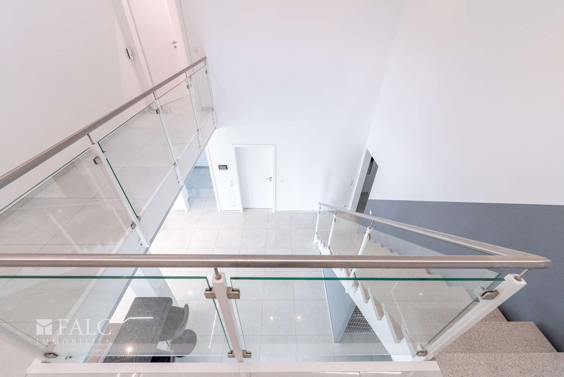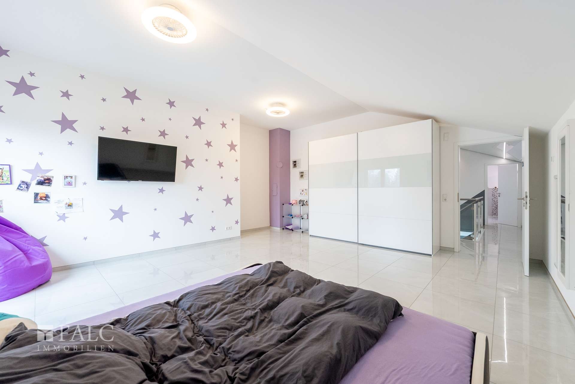 Über eine modern gehaltene Treppe gelangen Sie in das Obergeschoss. Hier finden Sie zwei XXL-Kinderzimmer, die individuell gestaltet werden können, sowie ein weiteres Badezimmer. Eine offene Galerie verbindet die Räume und schafft ein luftiges, offenes Ambiente.